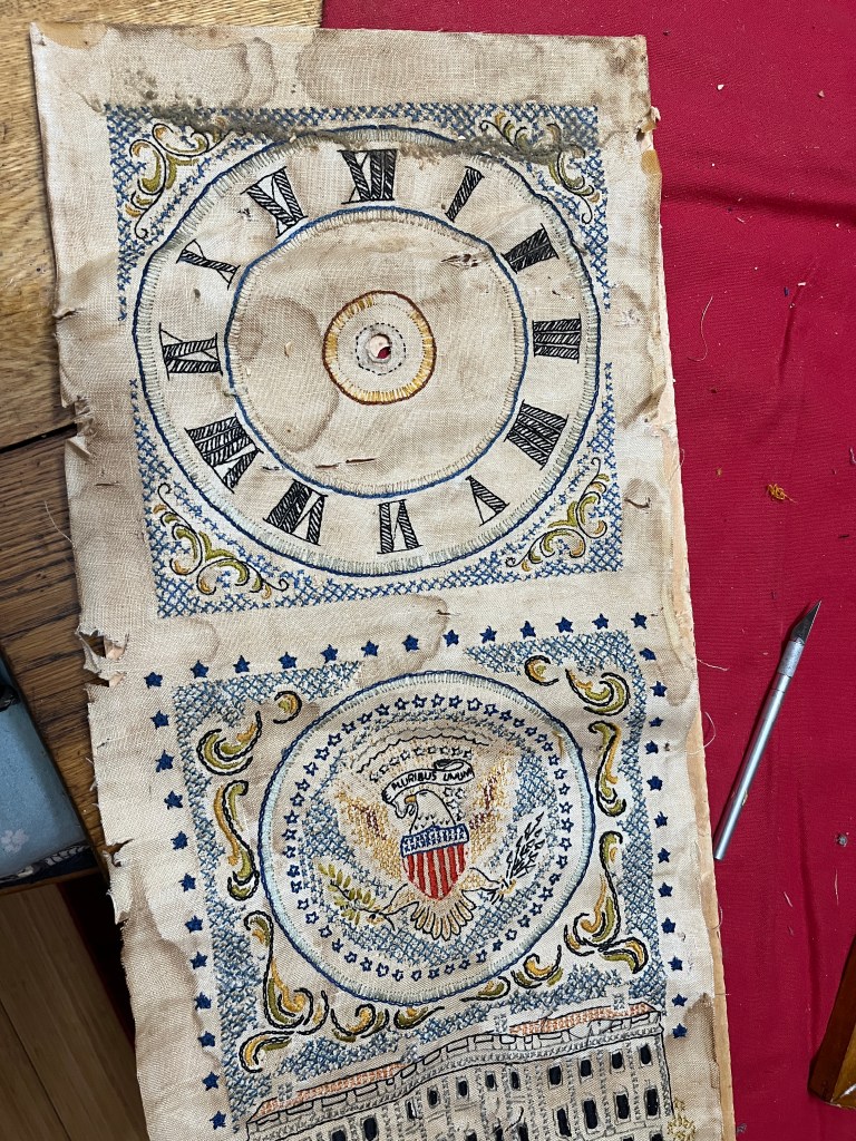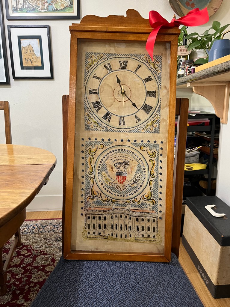 Last November, I found Grandpa Nelson’s old clock in the garage. His mom, Mona, had embroidered it for him and his sisters when they were little, about 60 years ago. Over many years and many moves, it had gotten stained and damaged.