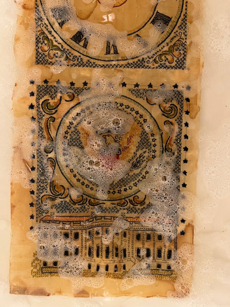 I decided to take a chance on repairing it. I peeled the fragile fabric off its Masonite backing and gave it a wash. The stains faded, but didn’t go away.