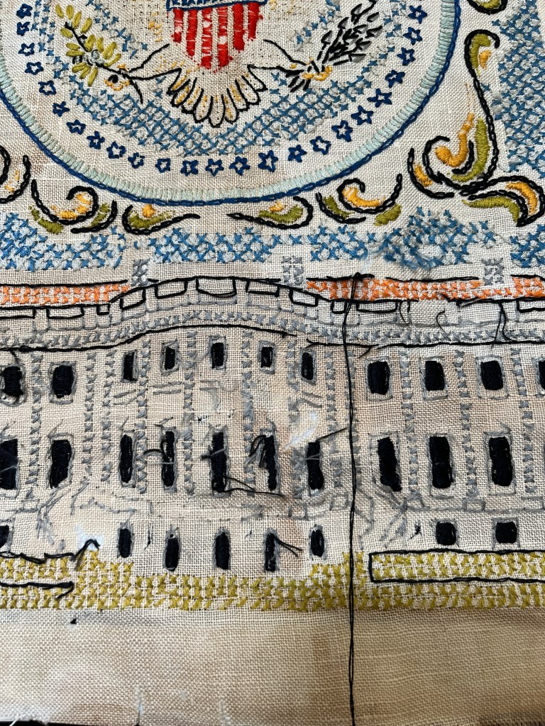 I added bits of embroidery to spiff it up a bit. A stitch here and there put some of the main lines back, while still letting it show its history.