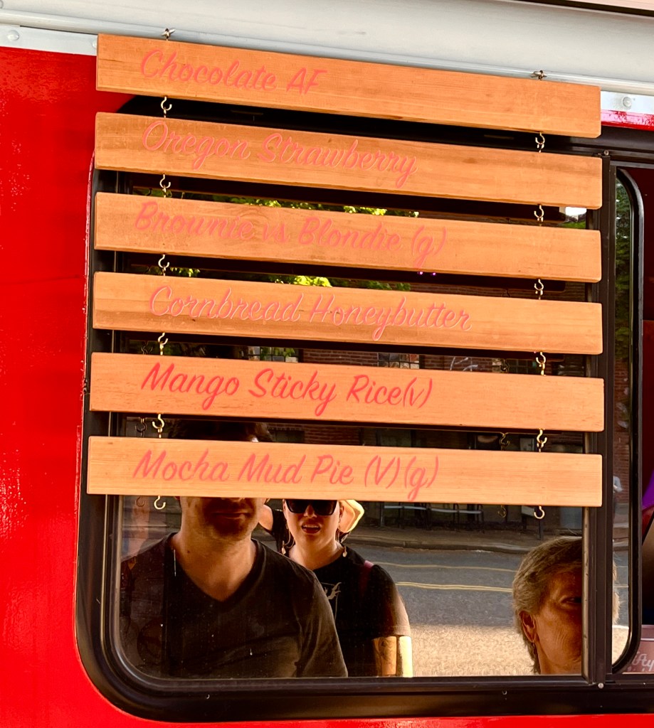 We were sad to see the lovely interior torn up and smoky. It had just been remodeled last year after being shut for a long time after the pandemic. Once the fire was out, Owner Chad Draizin and his crew took matters into their own hands. They parked the ice cream truck in the car bay at Burnside Collision next door, and were serving up six of their delicious flavors.