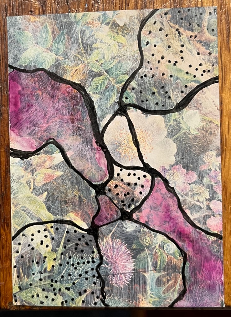 Then I used the same soft focus backgrounds for some neurographic art, which seems to be just lines which cross and create negative space. I like how the flower shapes play with the flowing black lines. I gave some of the spaces dots, and some a wash of color. they don’t say anything, but they’re pretty.