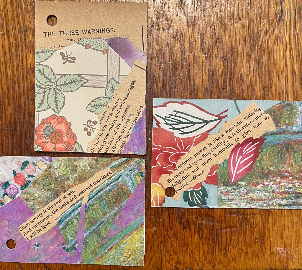 Just before my hand gave out for the day, I picked up some scraps from the cards I’d made and a page from an old, old book, and made three more.