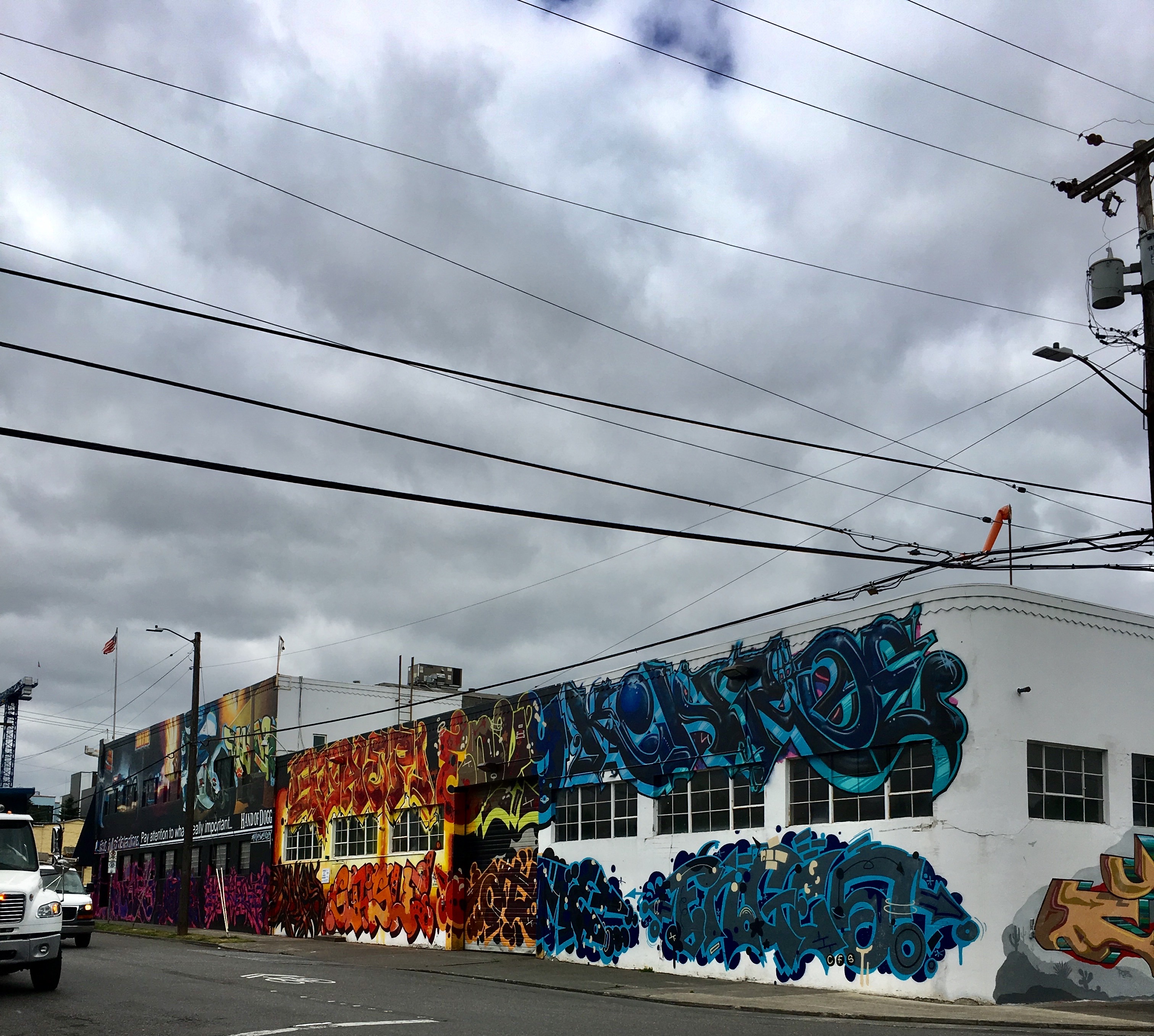 In Kerns, the old Sunshine Dairy building is due to be torn down and the lot turned into a high rise apartment building. It is home to this extensive, colorful mural. I like to mention the difference between “tagging”, which is just scribbled names or words, and “street art”, which demonstrates creativity, planning, and skill. This mural, which I would most definitely call street art, will disappear when the building does.
