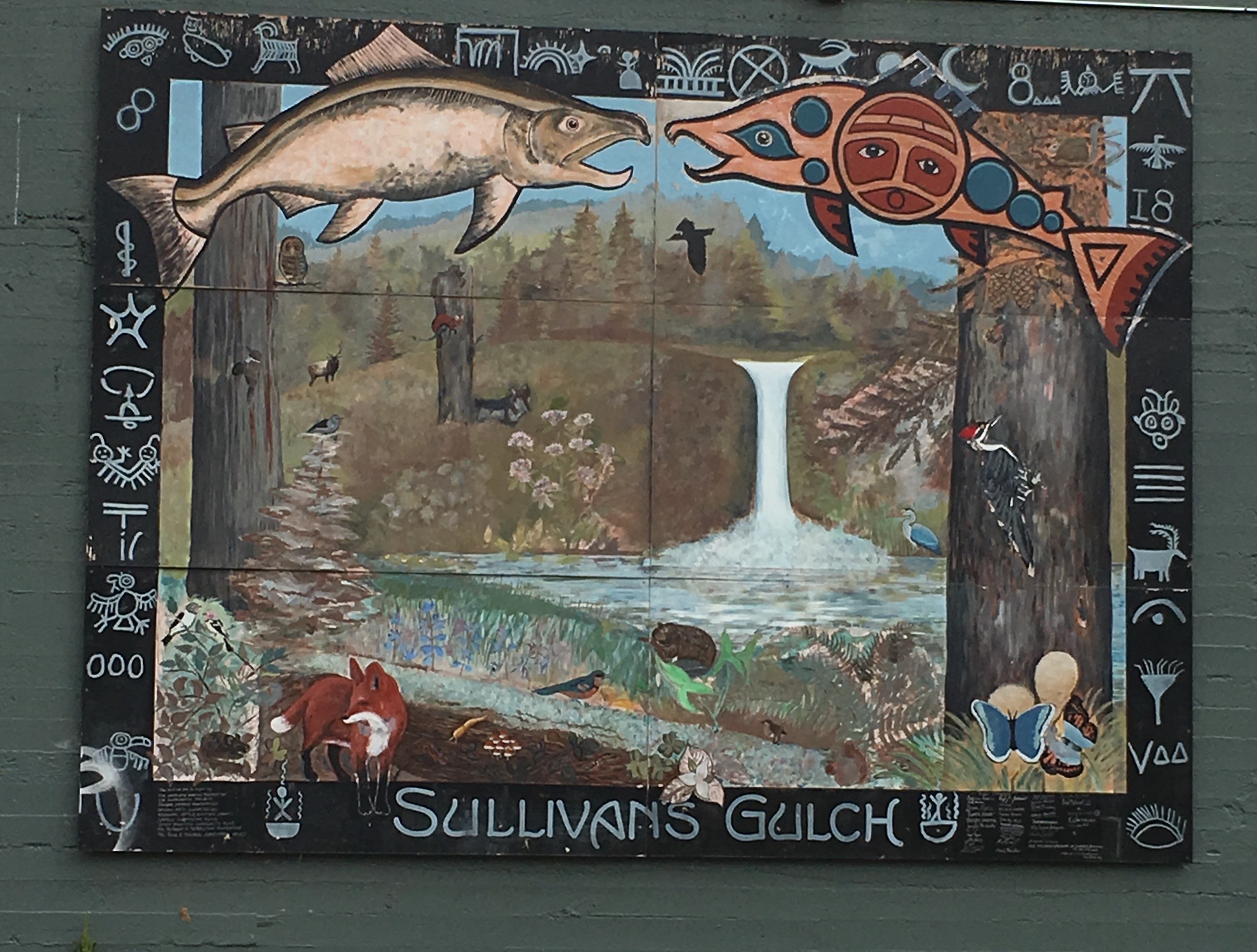 Crossing into Sullivan’s Gulch, we found this mural to remind us where we were. It was painted by volunteers and shows Native art and other original occupants of the place.