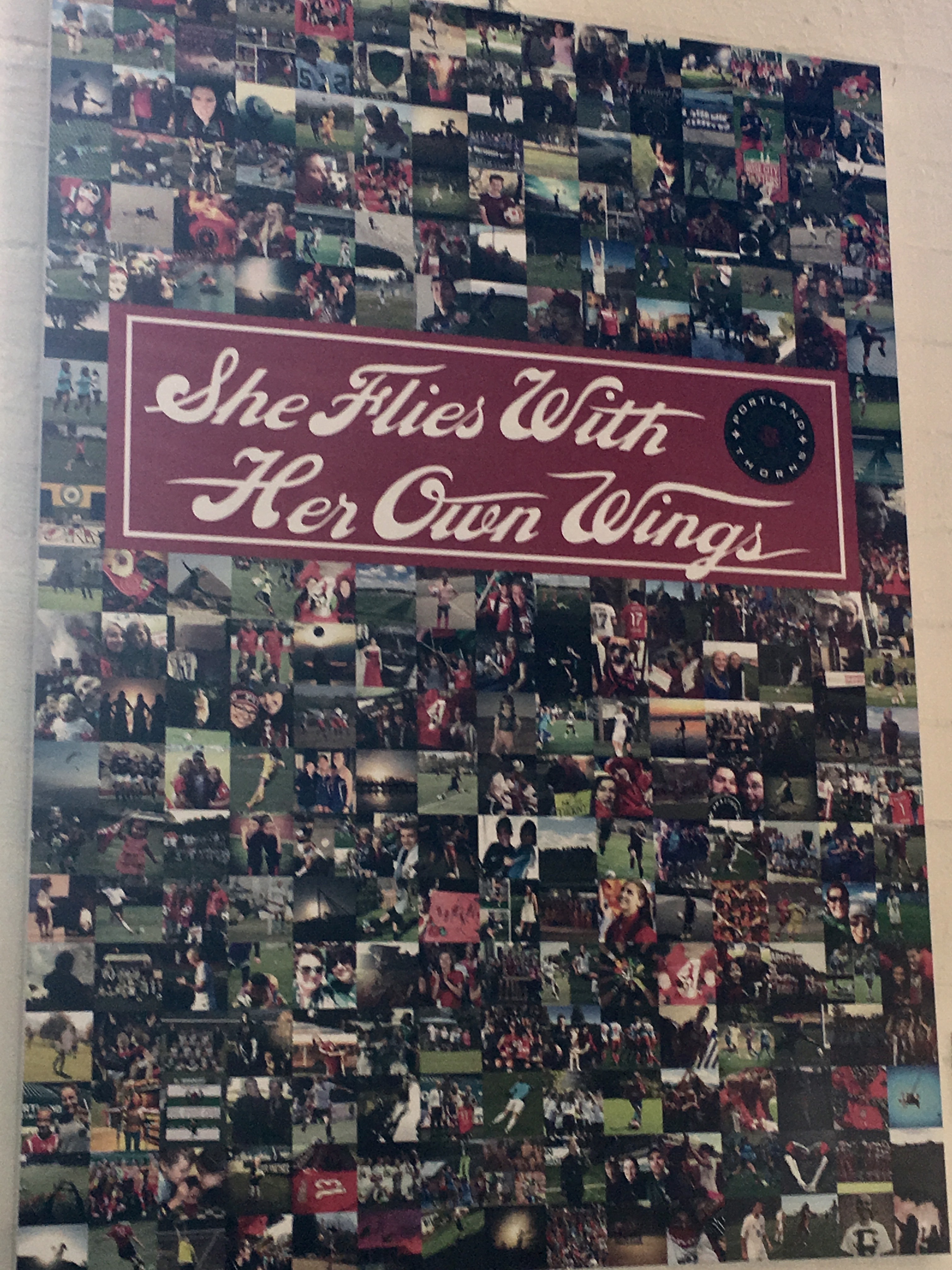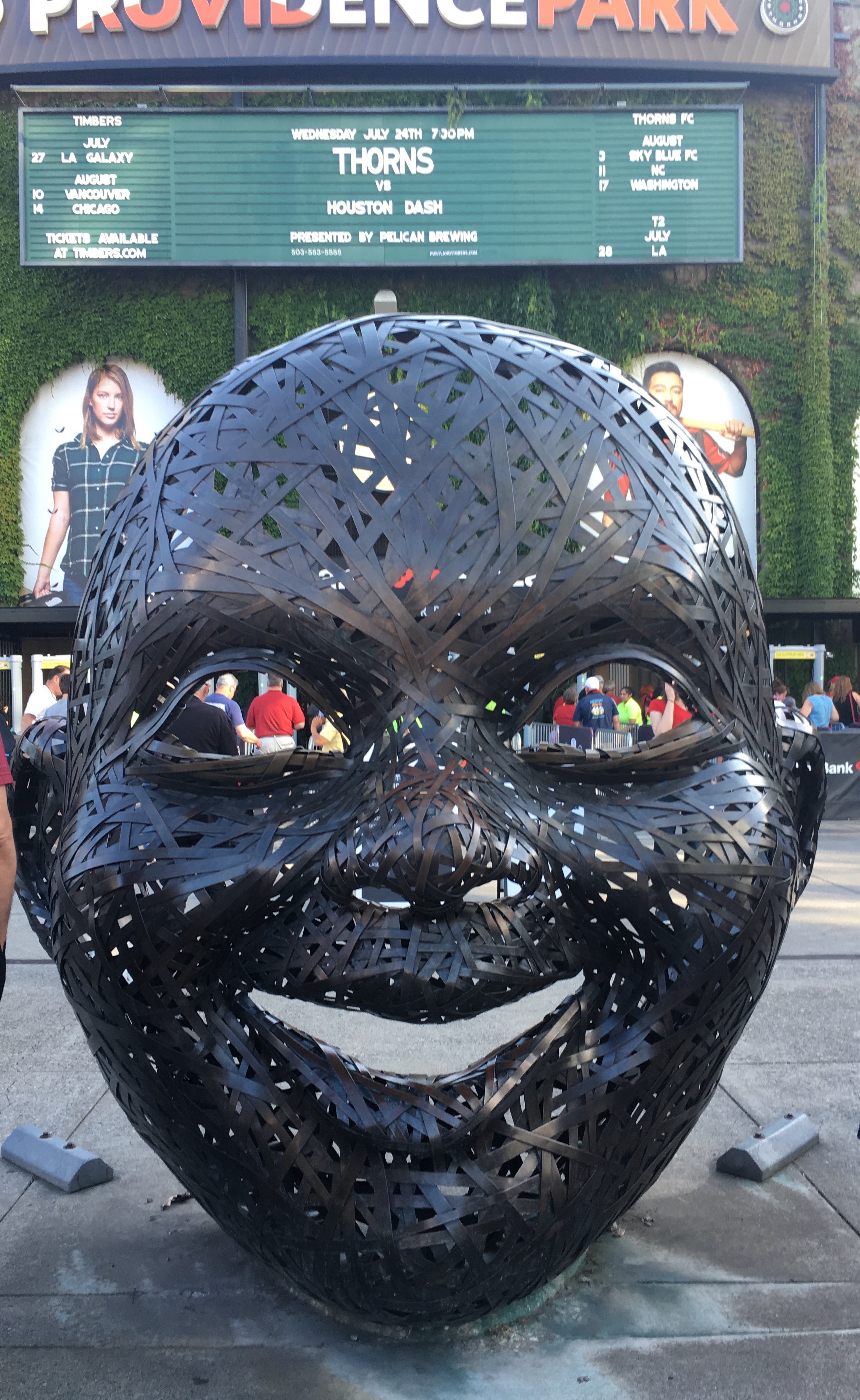 The buses and trains were full of folks wearing green, red and black, as well as Thorns scarves and tee shirts, as we headed downtown. A river of happy fans moved toward the stadium. Providence Park has just finished a multi-year remodel to increase capacity and modernize the facility, and this is the first time I’ve seen it unwrapped. Outside, there was art and new decoration.
