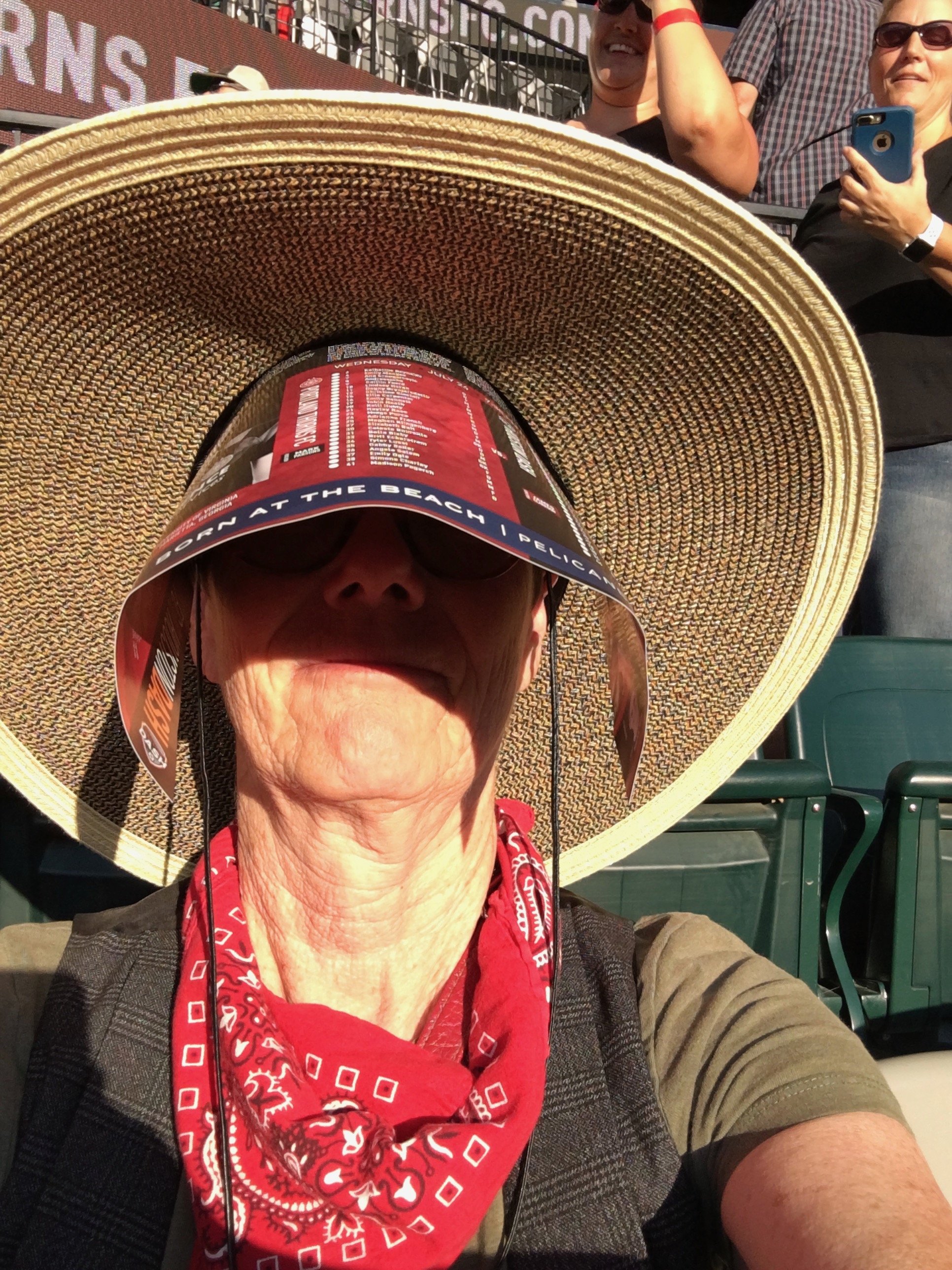 Our seats faced due west, and the sun was RIGHT in our eyes until it ducked behind the stadium. I improvised and was more comfortable, but I did look like I had borrowed Laura Ingalls Wilder’s poke bonnet .