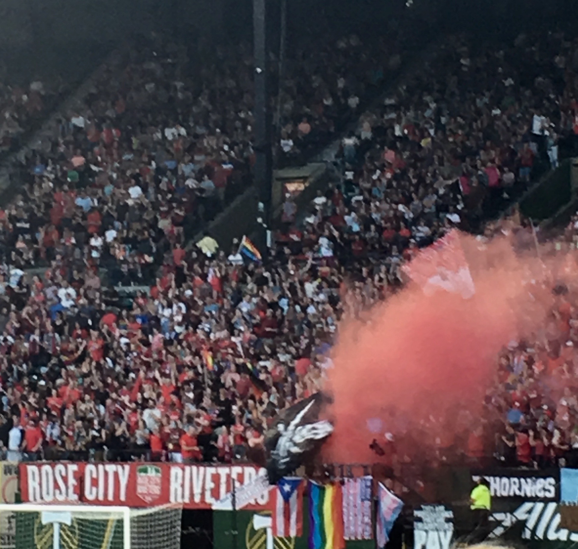 The most avid fans call themselves The Rose City Riveters, and all sit in one section. They have chants (led by energetic folks), and roared “One Goal Beyond!” for the first goal, “Two Goals Beyond!” for the second, and so forth. They even set off a bright red smoke bomb whenever the Thorns scored, and several sections march back and forth. It was fun to watch…from a distance.