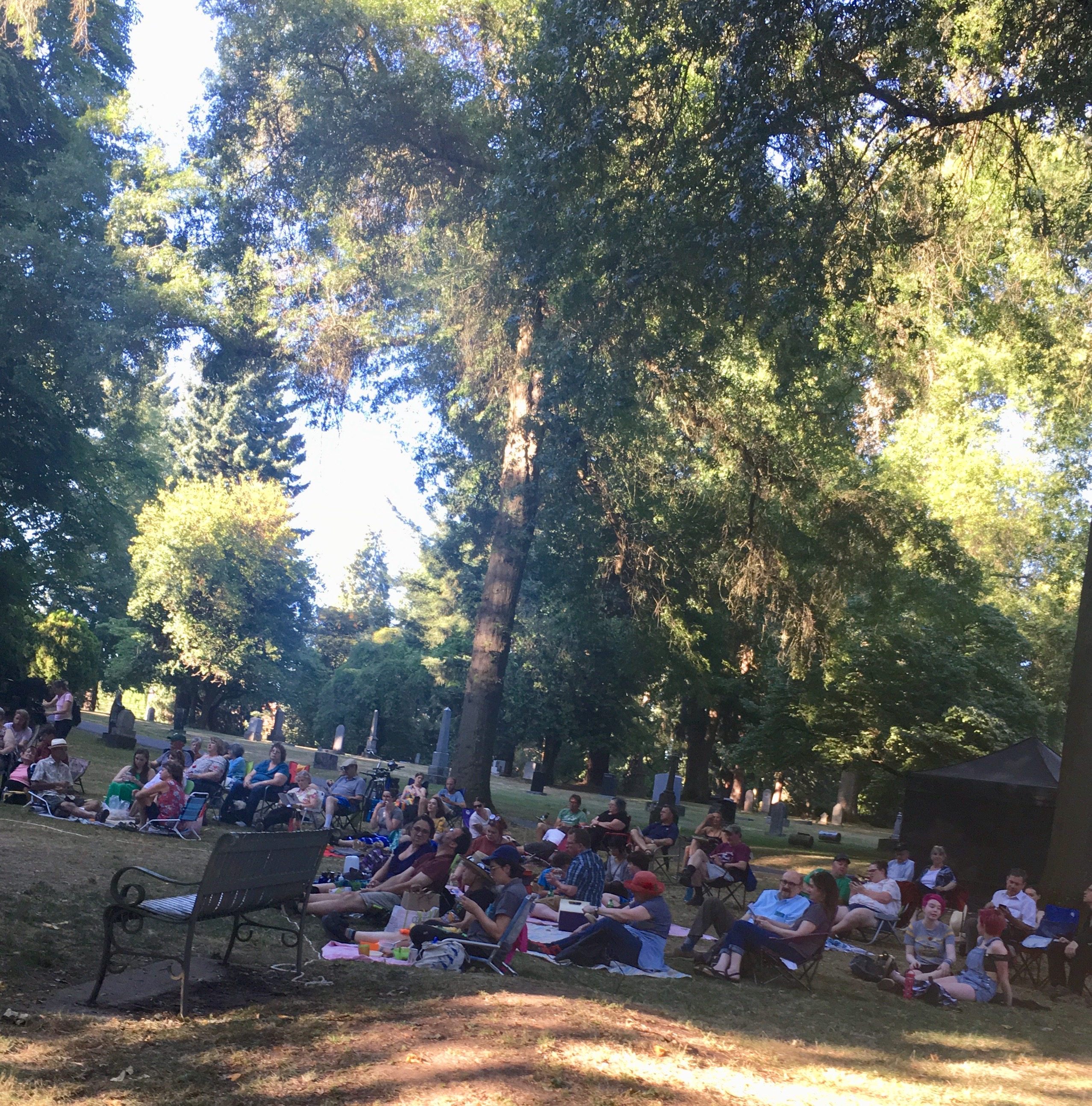 The play was performed at Lone Fir Cemetery by the Portland Actors Ensemble, and attended by about sixty adults and kids. People brought blankets, folding chairs, and picnics to enjoy.