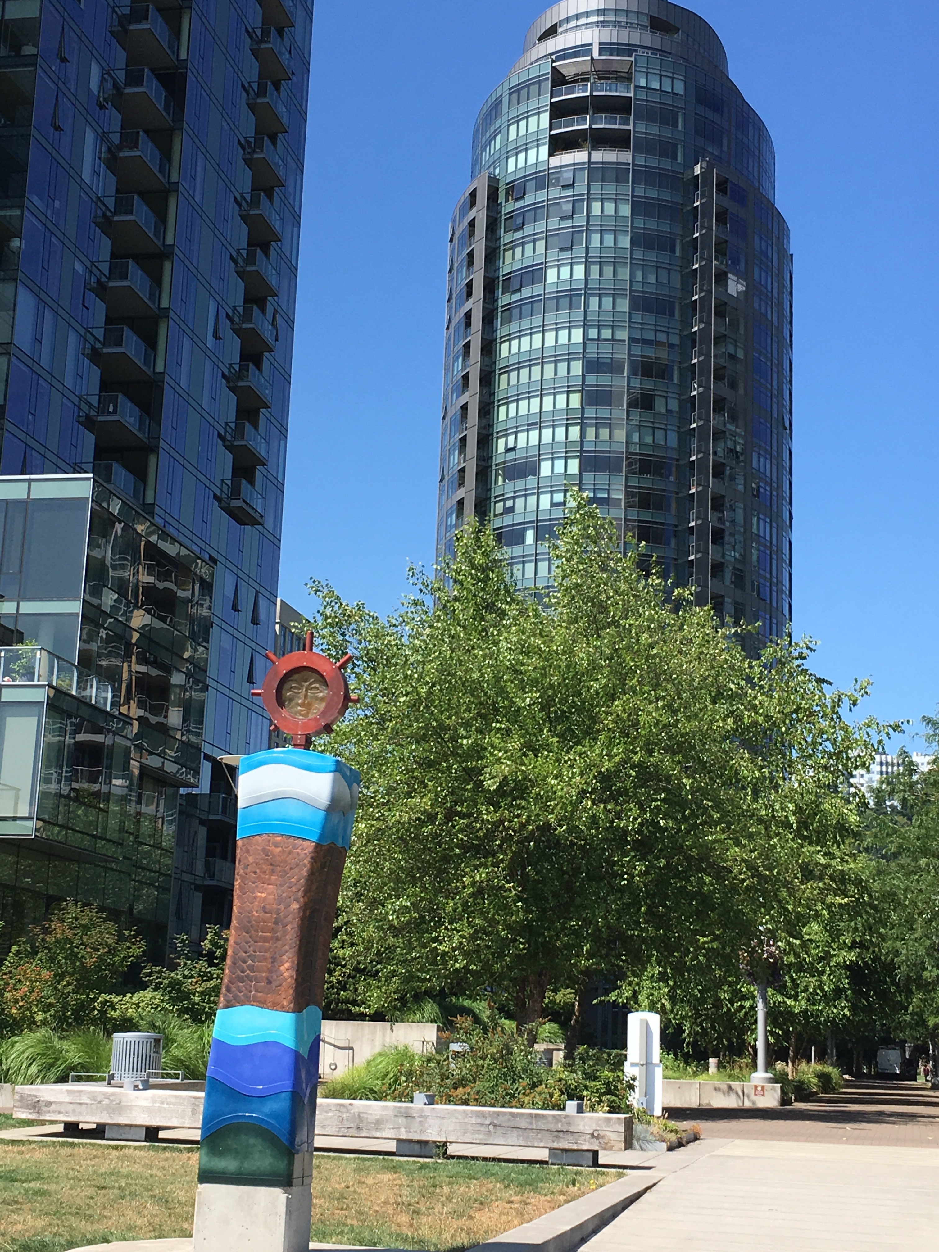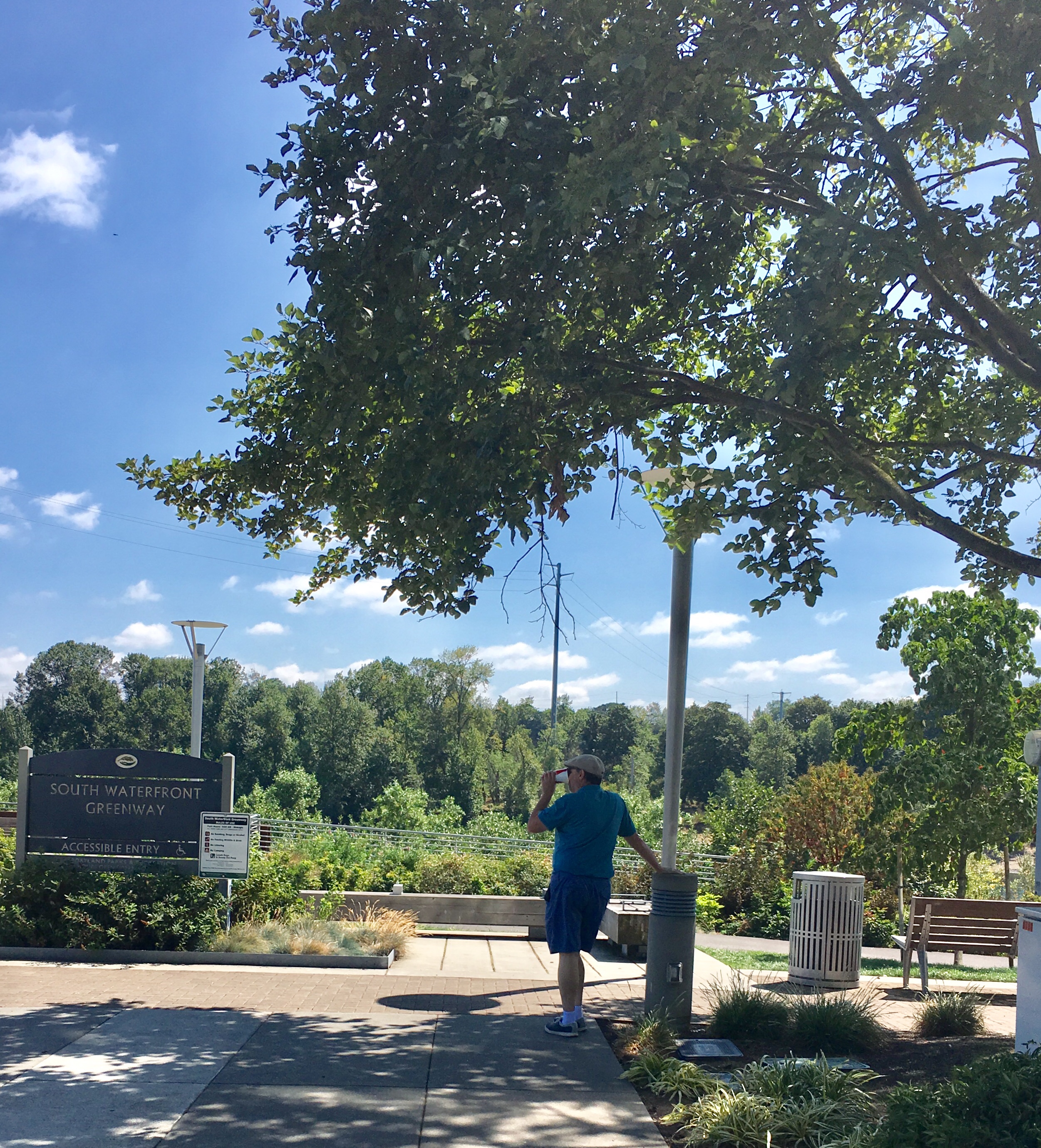 On the west side, we walked along through the glass condominium towers and came to the Lower campus of the OHSU. We had cookies and sodas to hold us until we found a good place for lunch. Grandpa Nelson had researched and knew that the South Waterfront Greenway continued south from here, so we wandered around, and there it was!