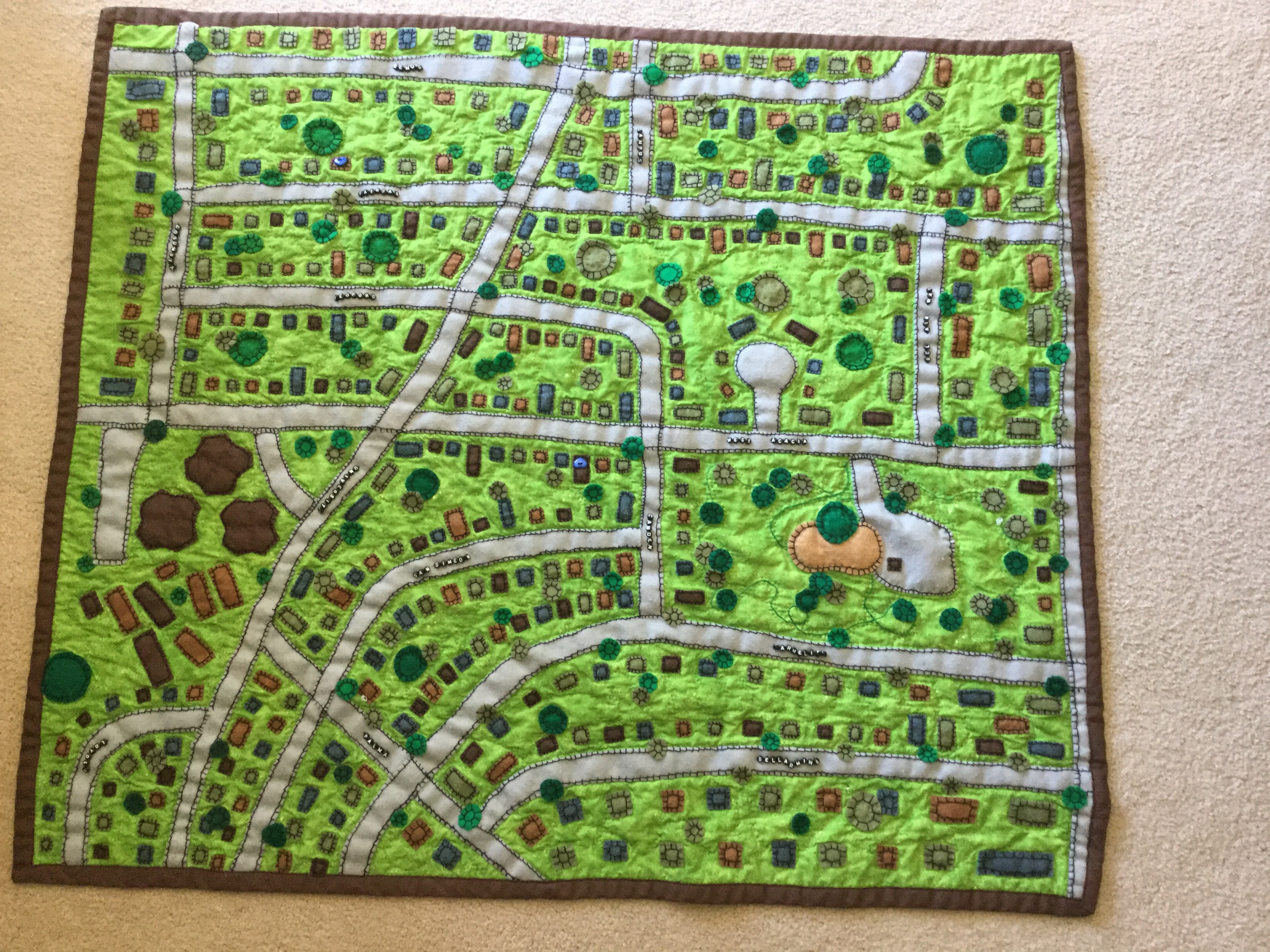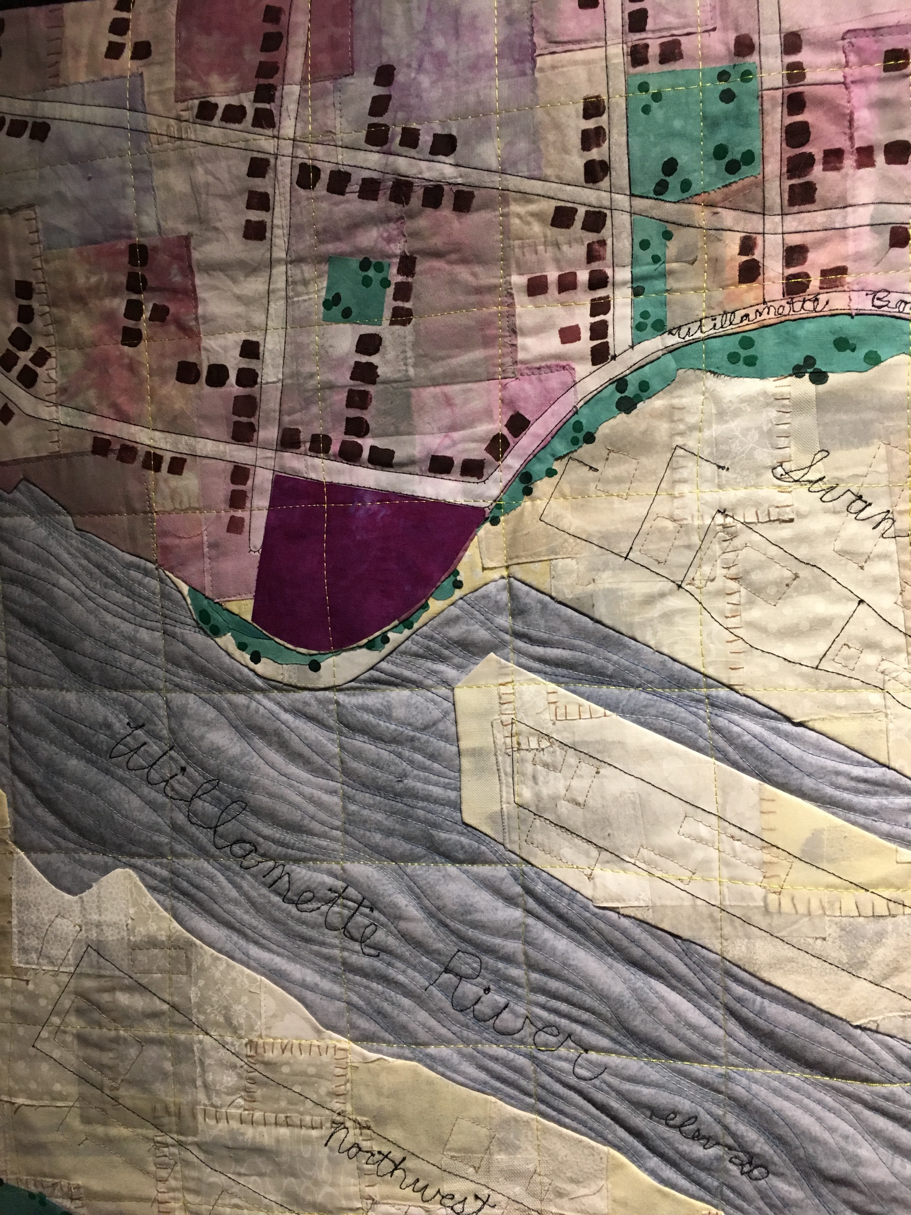 The theme of the exhibit was “On the Edge”, and was interpreted by about two dozen artists in beautifully different ways. The quilt above was called “On the Bluff Where I Live”, and looked sort of like the quilt I made for you a few years ago, being a map of our old neighborhood in Salinas, except that the artist’s neighborhood is on a bluff overlooking the Willamette River, and she used embroidery for names instead of beads. My quilt is below.Other quilts showed different edges…technology, sanity, shorelines, day and night. They all were interesting in different ways, encouraging me to finally get out the fabric I bought months ago to make a quilt about my new neighborhood here in Portland. I get nervous, because once you cut fabric, you are committed. But, really, what have I got to lose?