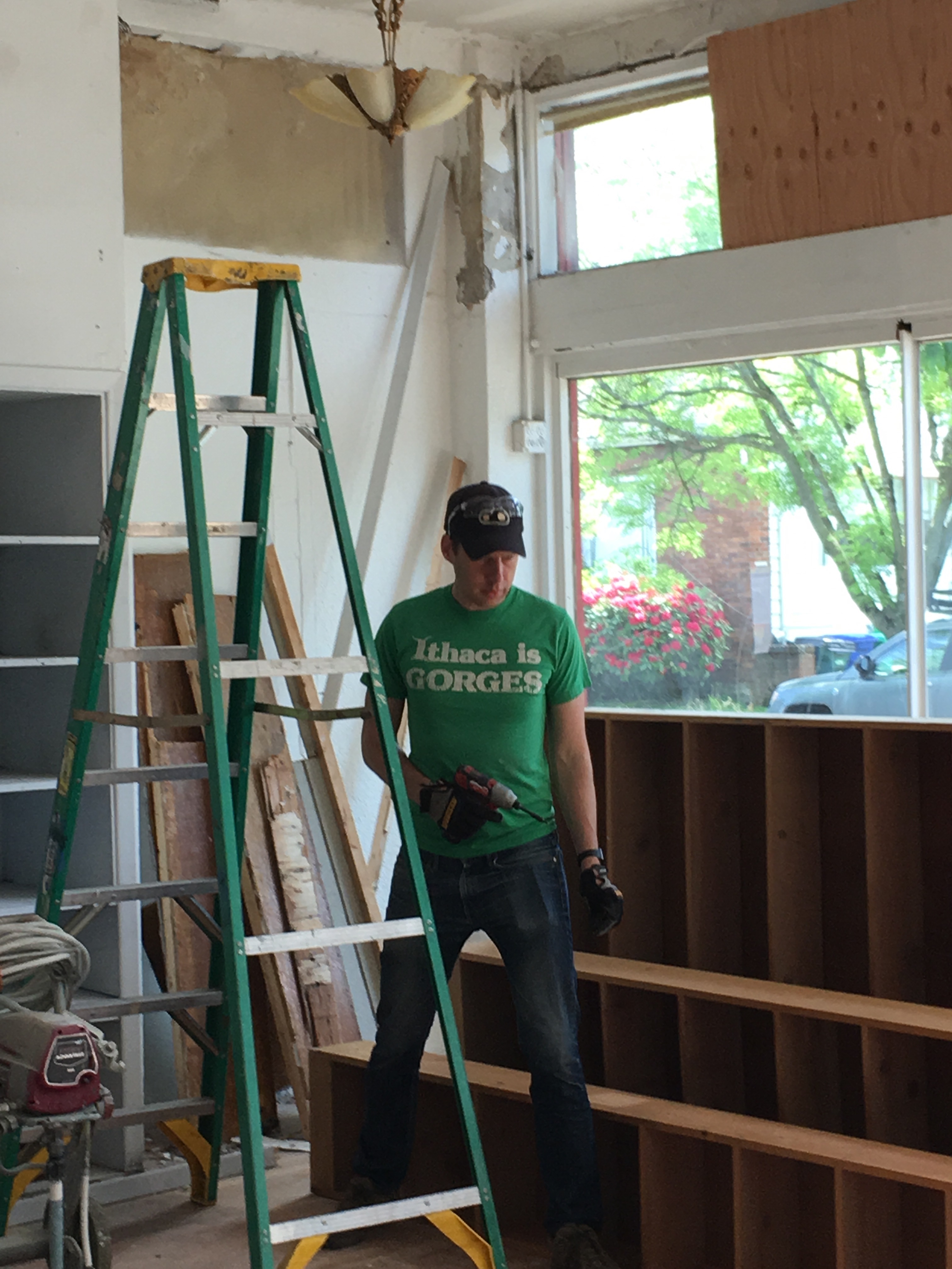 After we declared victory over the door, Katie’s friend Patrick and his son Arlo came to help. Patrick ripped out an old bookcase and Arlo removed random screws and nails from the walls with his power drill.