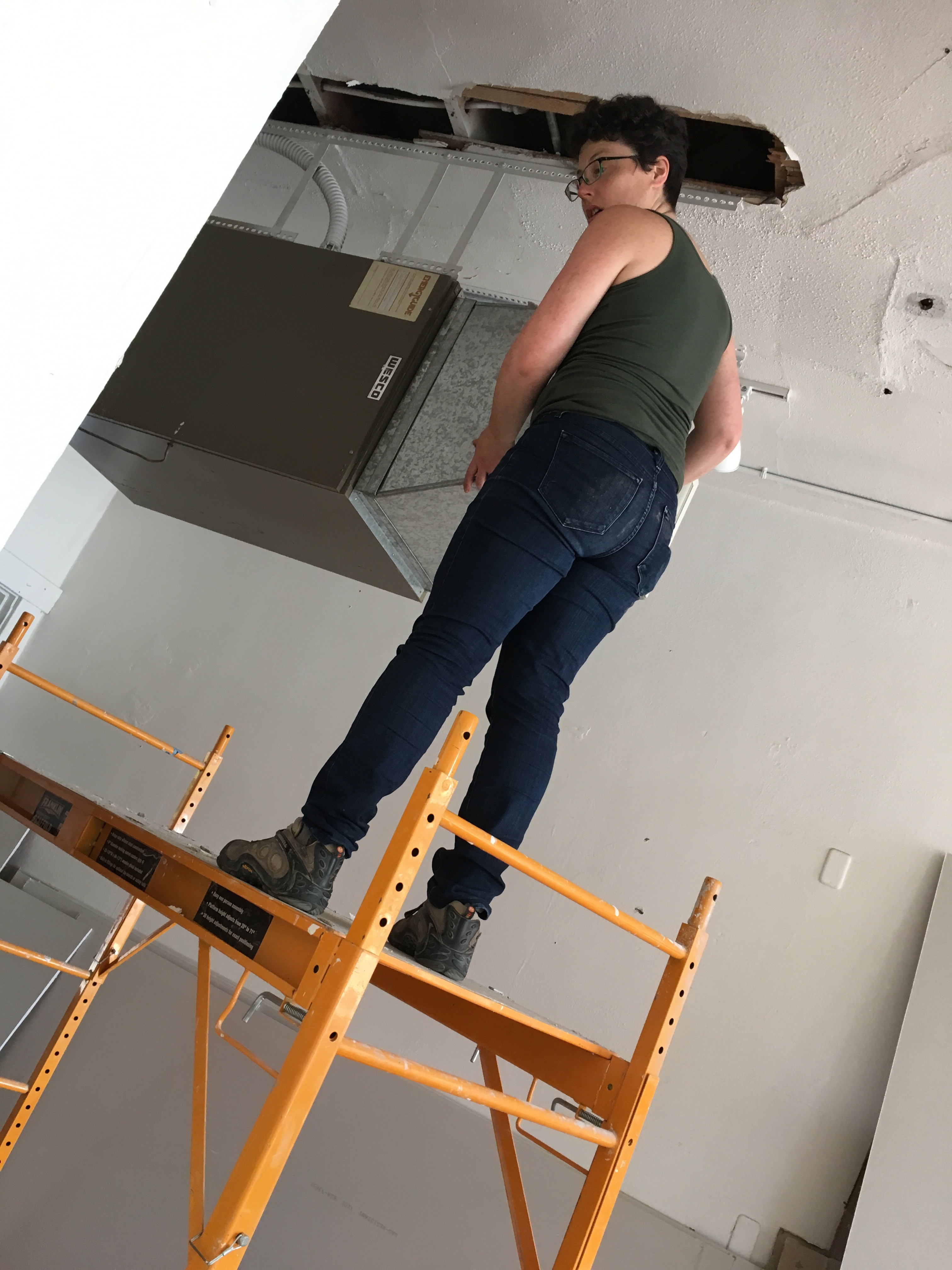 I hauled wood out to a pile in the backyard as Katie started working on removing a heater…. but had to stop when she realized she needed more electrical expertise. Sparks are a very good reality check!