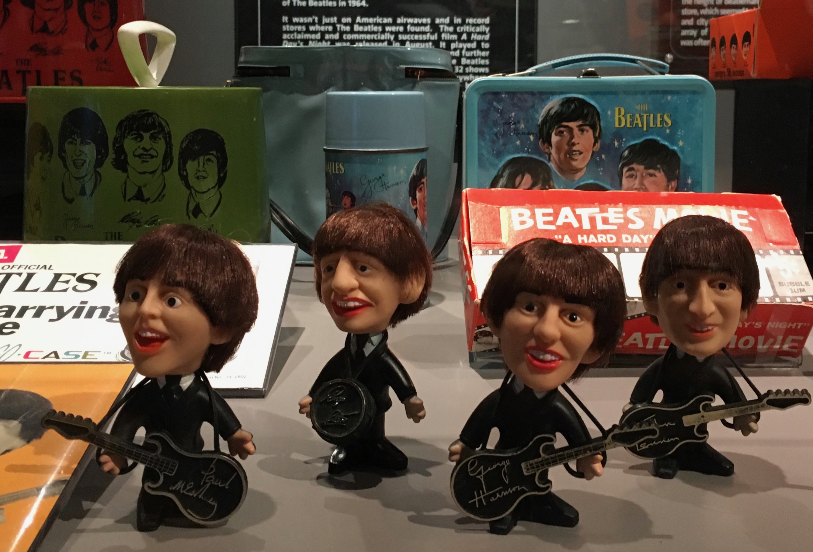 There were the lads’ very own instruments, and some of their costumes, as well as tickets, photos, and all sorts of doodads, including toys and things that were marketed like crazy. I remember kids with Beatles lunchboxes, and I woke up Saturday mornings to the Beatles cartoon show.