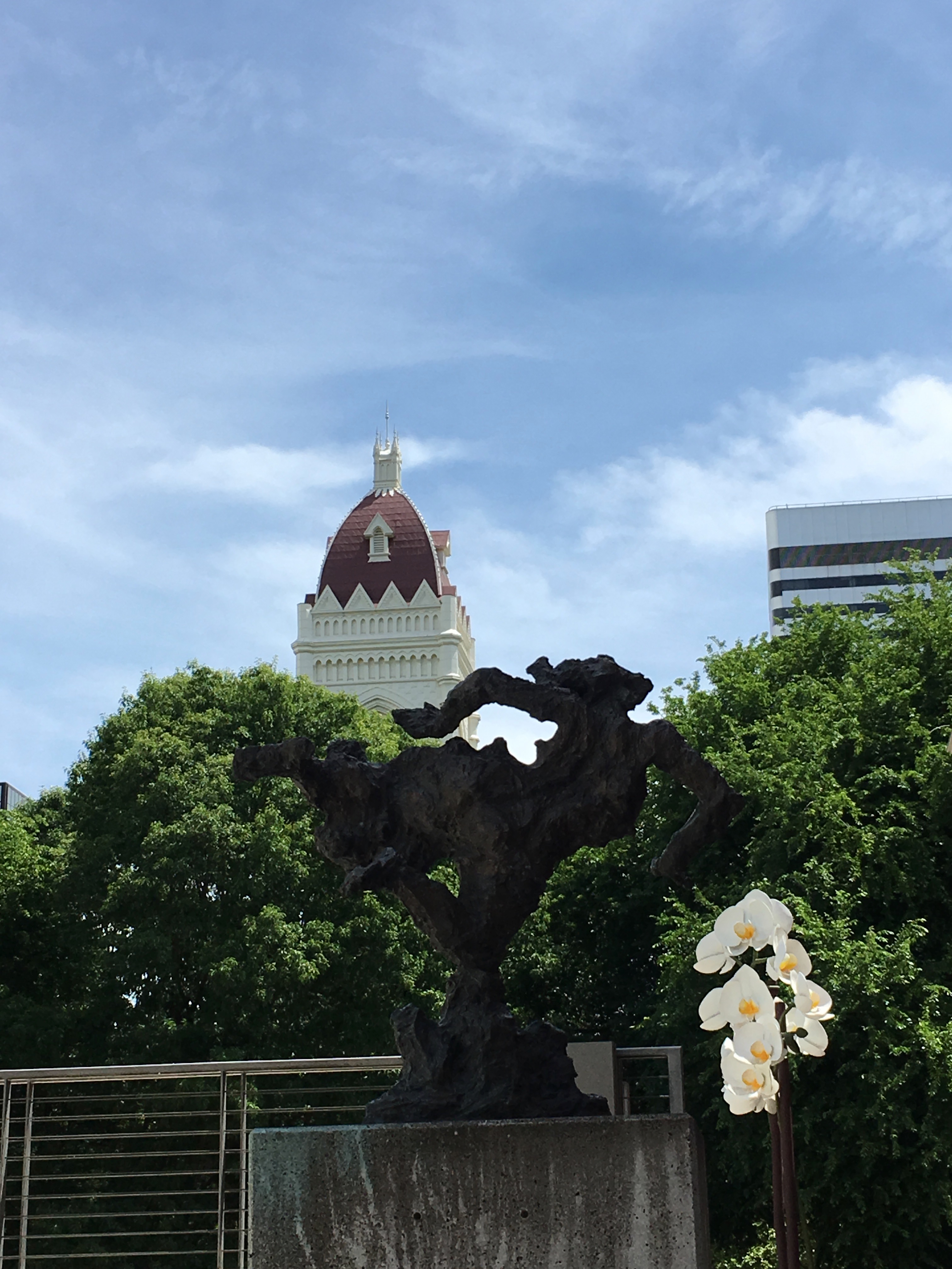 Today I noticed how the tower of the First Congregational Church made a pretty arrangement with the giant Orchids, the elm trees, and Mistral #2.
