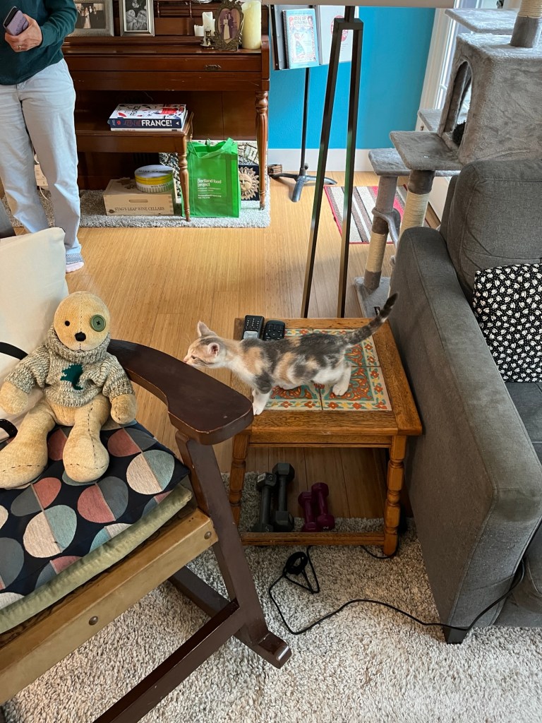 As they got to know the house, Moxie lived up to her name by going everywhere all at once., stopping for just a moment to say hello to our resident stufftie, Harold.