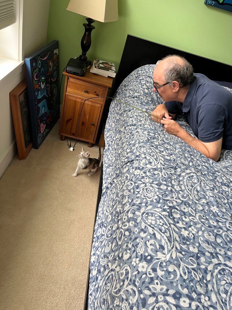 And once we were all in the master bedroom (known for now as Kitten Central) Grandpa Nelson discovered the joys of Cat Fishing! It’s nice to see Mouse’s favorite toys being played with again.