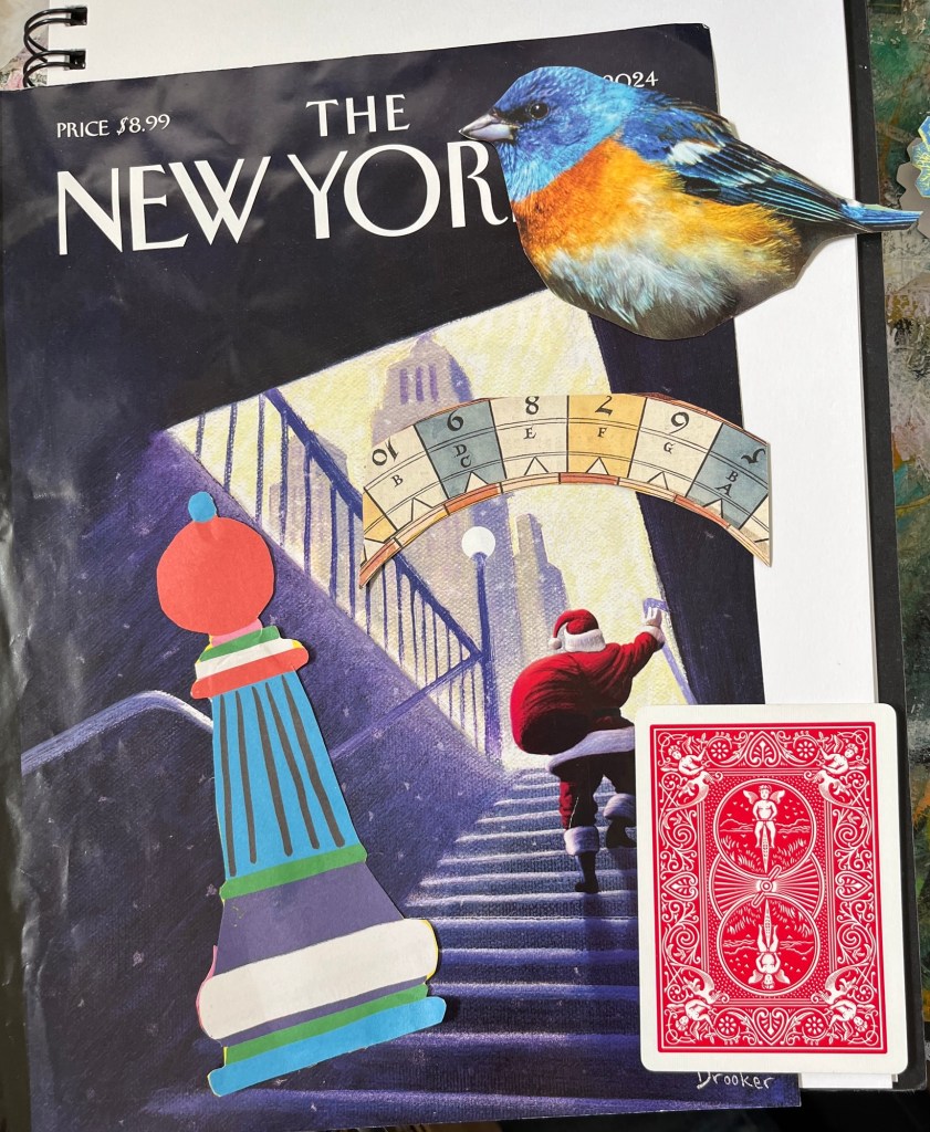 My first harvest wasn’t promising, but as I dug some more, images started to fit together. The stairs from a New Yorker cover would lead to the door, a pair of painted screens could the pillars by the door, a playing card the actual door, and a ridiculously huge bluebird is a suitable decoration.