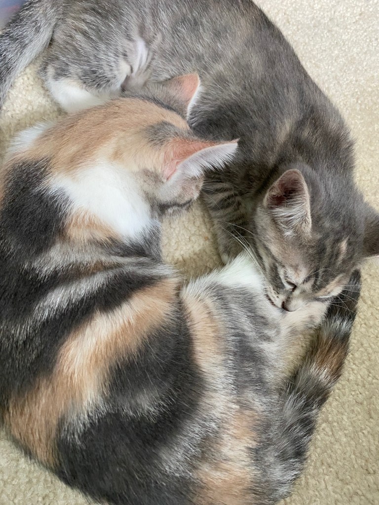 And it wasn’t long before they wore themselves out, and us, too. Total cuteness overload as they fell asleep in an adorable kitten curlicue.