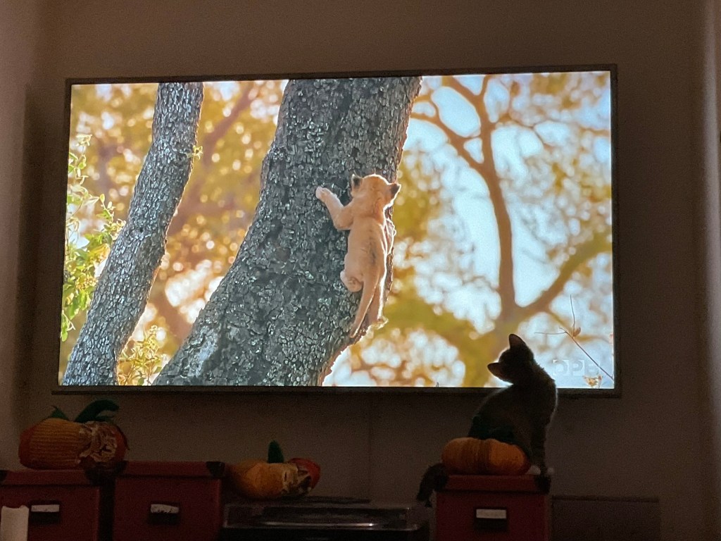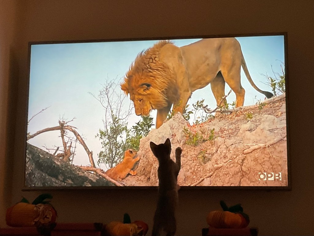 Their latest fascination is the television. Molly discovered it last week during a Big Cats special on PBS, watching with concern as a male lion seemed to be stalking a small cub.