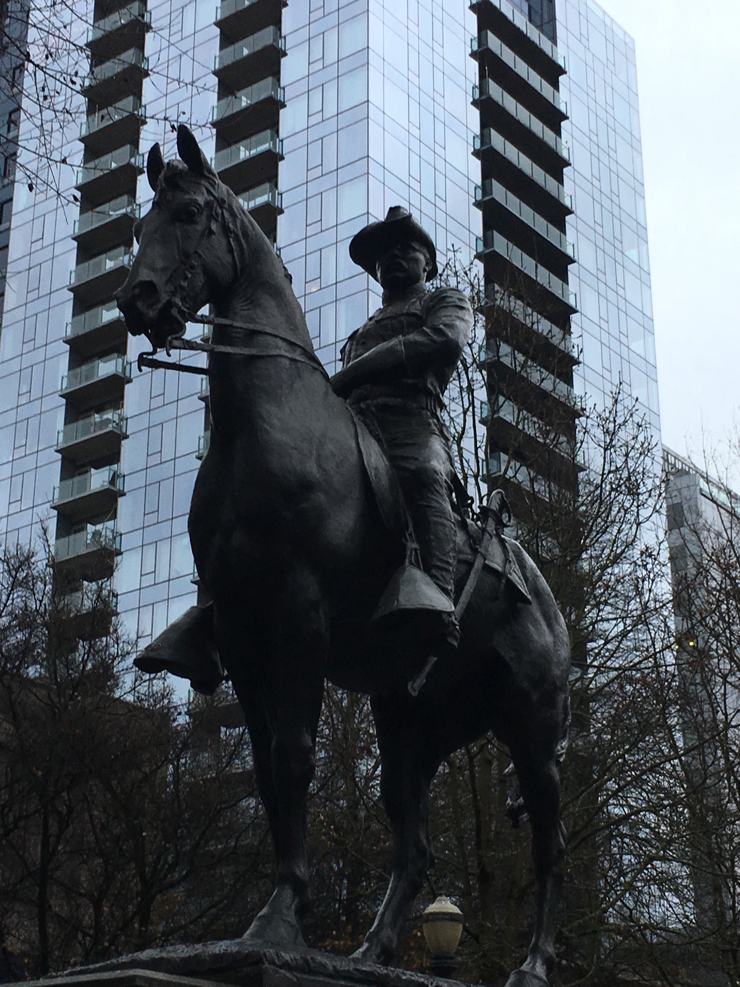 On our way back to the bus stop, we walked south a bit to pay our respects to Teddy Roosevelt. A statue of him, called The Rough Rider, by Alexander Proctor, stands between the Art Museum and the Historical Society.