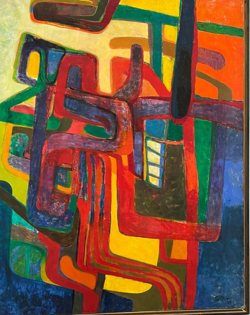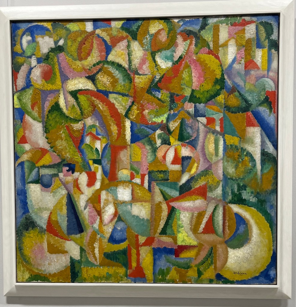 And then there is this piece, which is a very abstracted , but still representational. See the houses? The clouds? The boats?And the woman? This is a fun kind of painting… part riddle, part artwork.