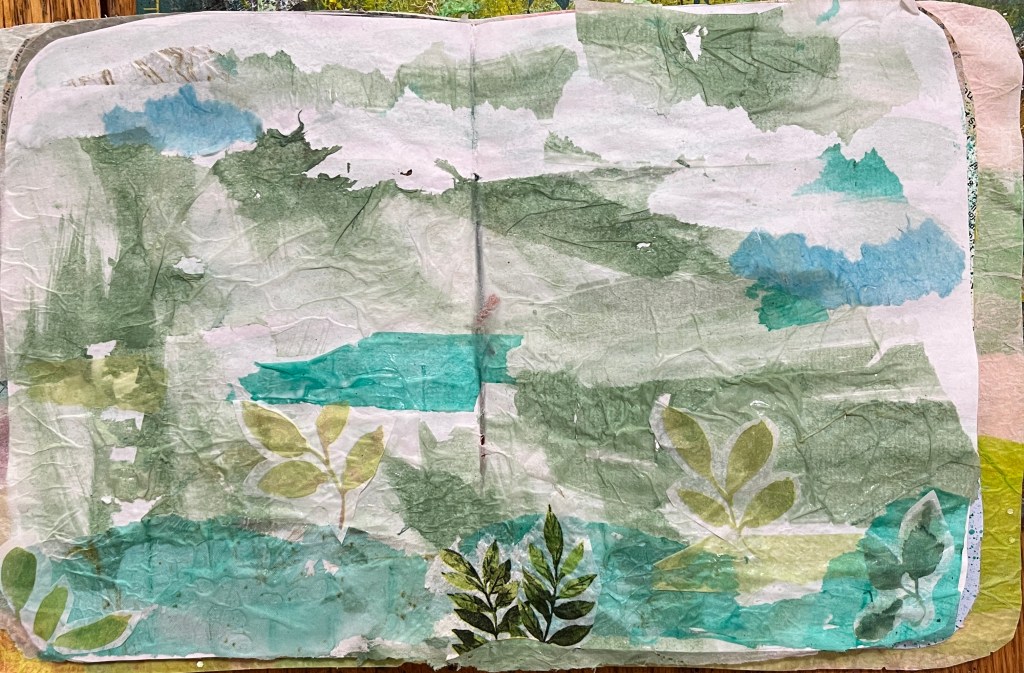 I made about eight postcards in all, and one even looked something like Ruthie’s idea, this lovely, opalescent landscape. Of course, following directions is always optional, but it’s good to try new things.
