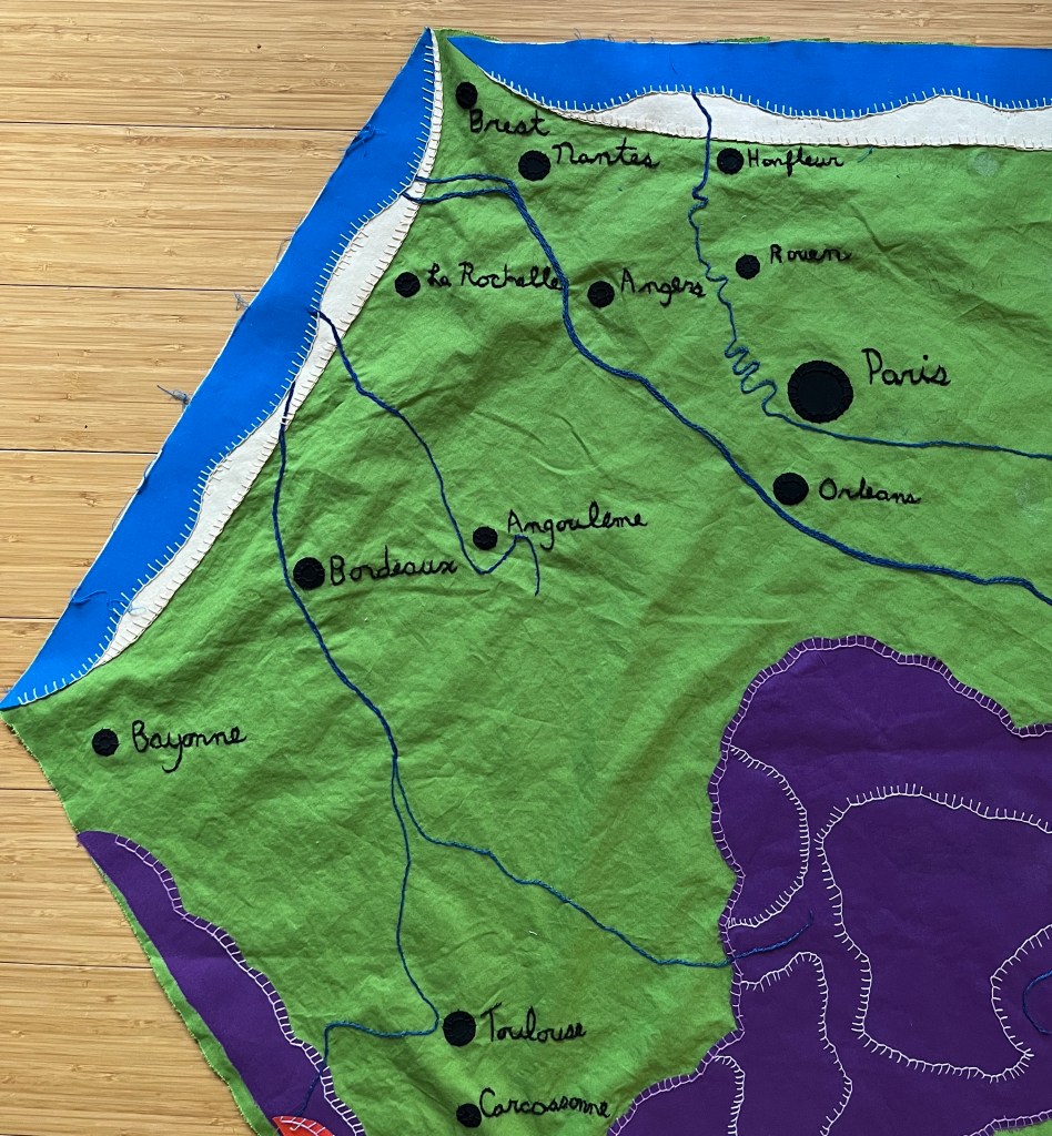 I was feeling pretty good about the shape of my highlands, mountains and shorelines on my French map quilt. Auntie Bridgett admired the lay out, then asked, “Are you going to put anything else on it? Like cities?”