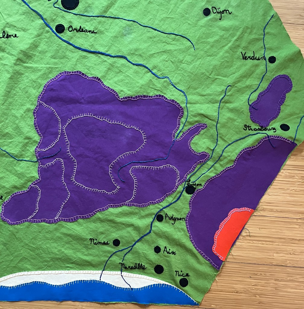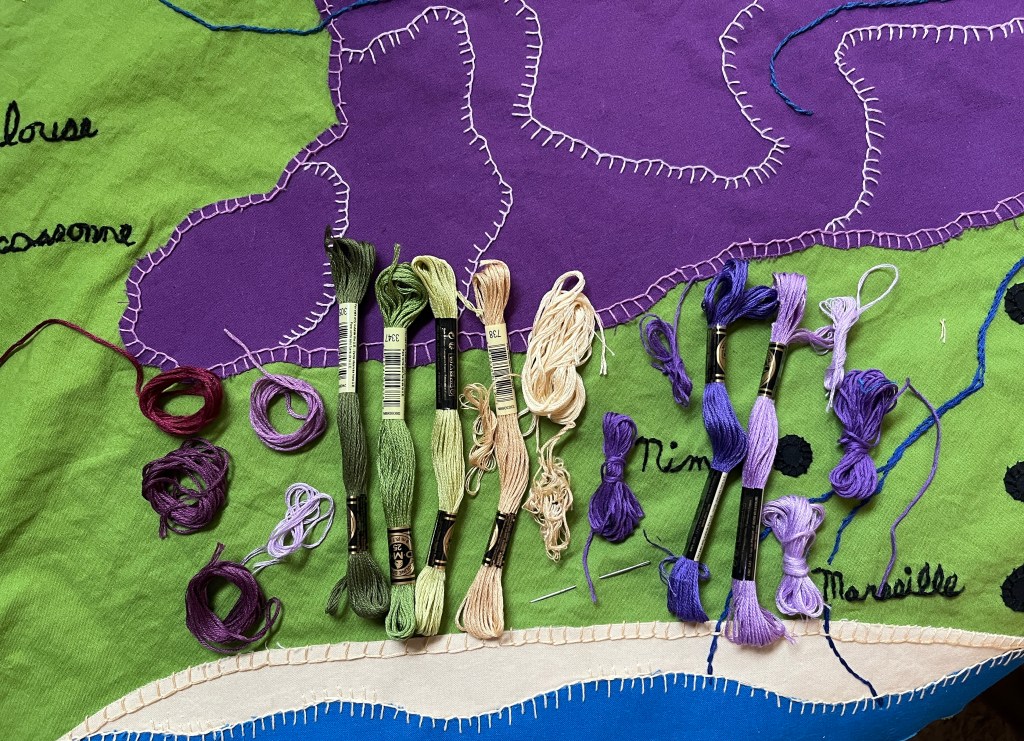 As I stitch more on my map of France, adding dozens of icons for row crops, vineyards and wheat fields, I feel like I’m looking backward and forward at the same time.