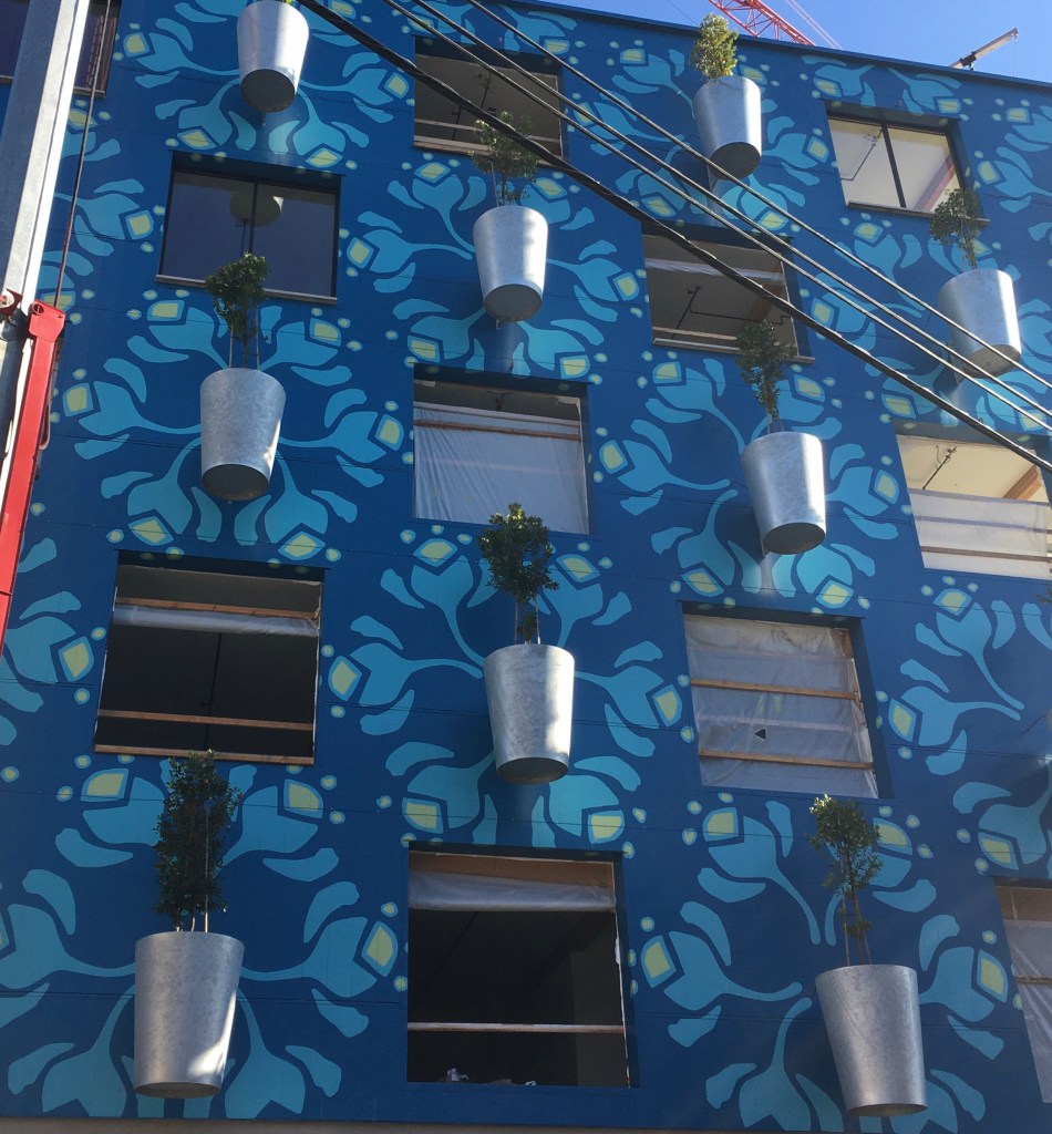 For months now, I have seen and photographed this interesting, tree covered blue building going up right beside the Morrison Bridge. I see it everytime I take the bus to downtown. I even walked right by it when we went under the bridge.