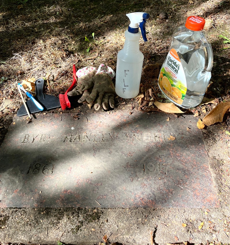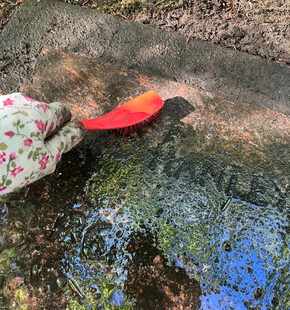 On my first trip to help, I took along the Friends of the Lone Fir recommended kit: Lots of water and a variety of plastic scrubbers and scrapers. I even wore gloves!