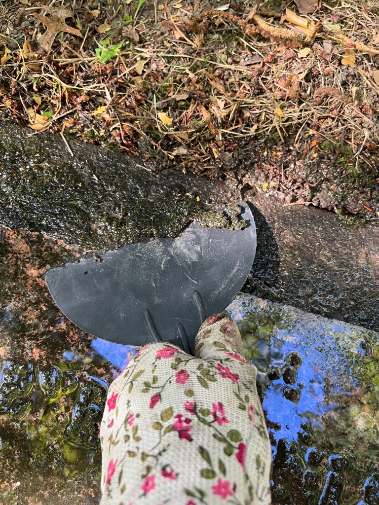 I poured on a lot of water to soften the crud, then used the plastic scraper to dislodge the heaviest moss encrustations.