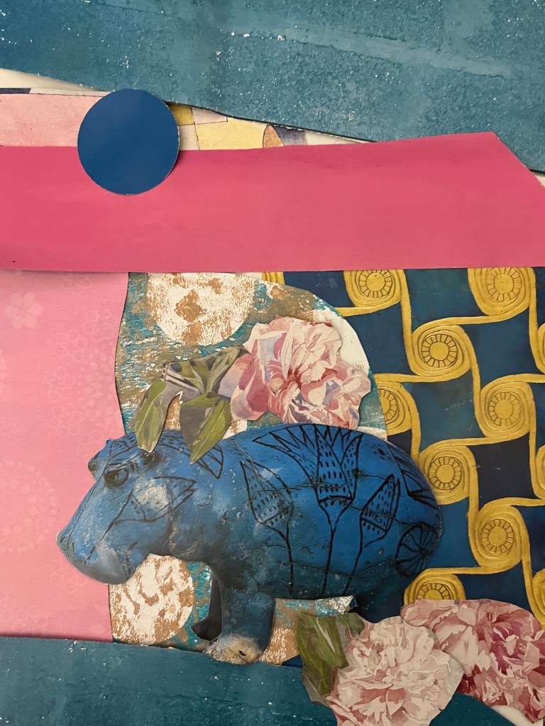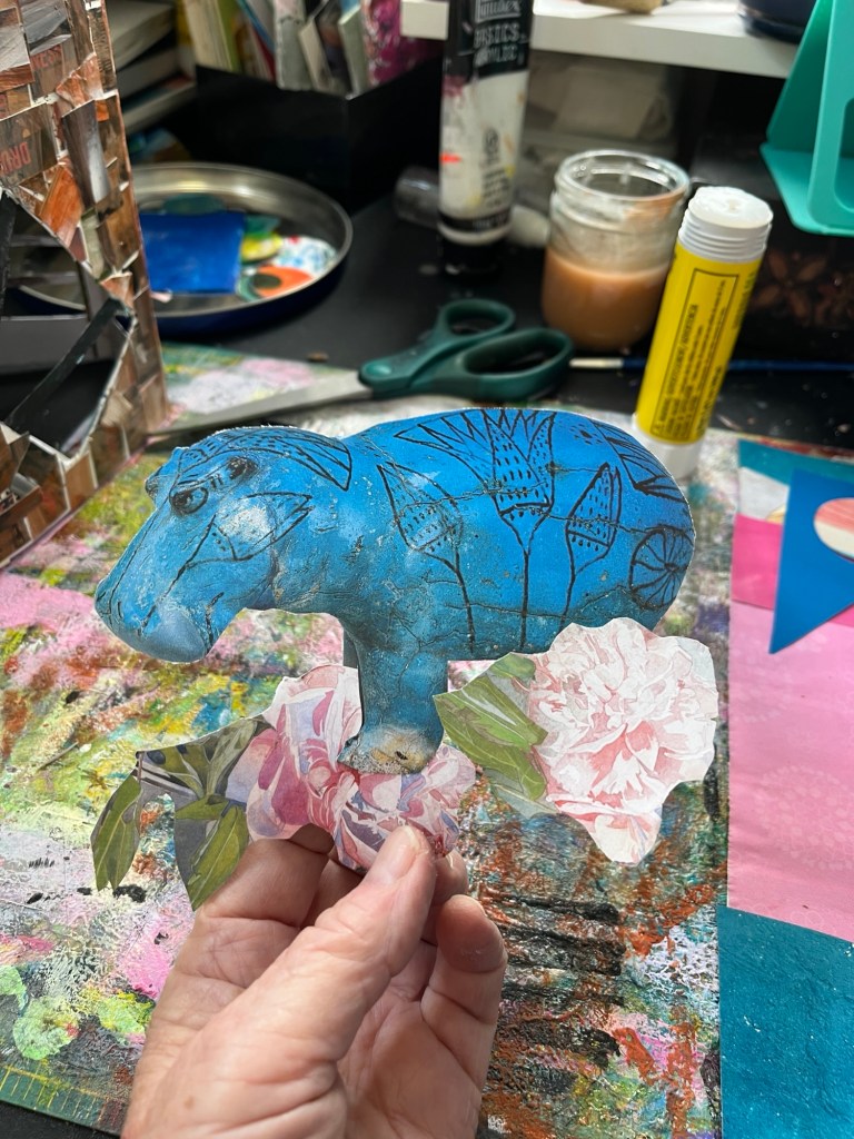 I glued the hippo and flowers together, but not down yet. This makes placing the focal points less nerve-wracking.