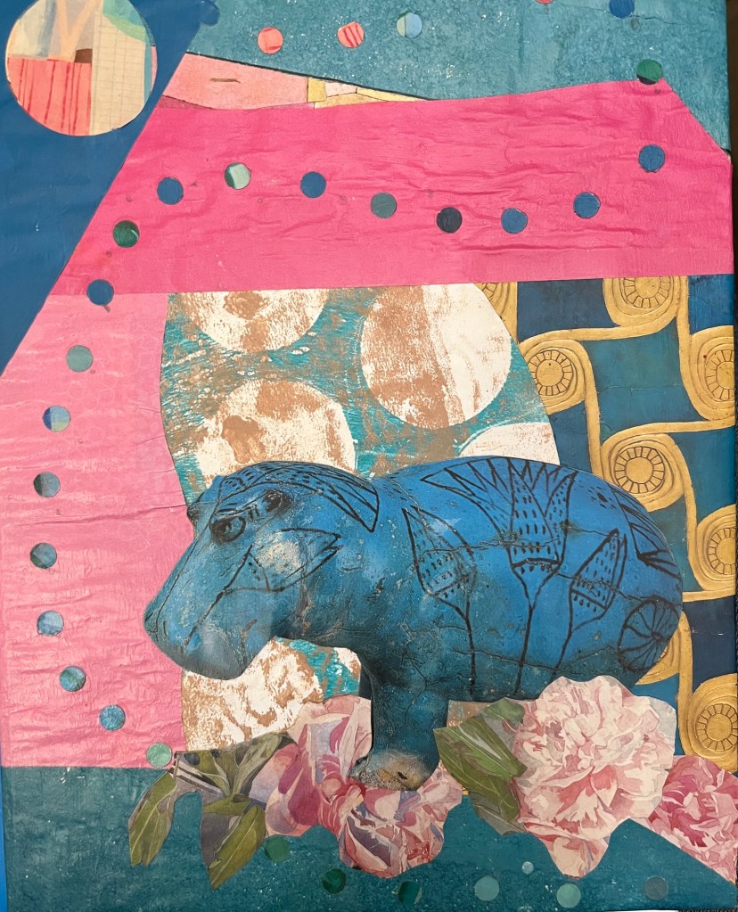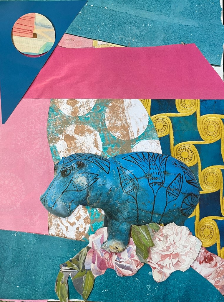 The last bit to be decided was the sun ( or moon). I wanted the blue to balance the bright hippo, but it looked too heavy. The circle cut from a rejected paper worked well, and the blue triangle set it off.