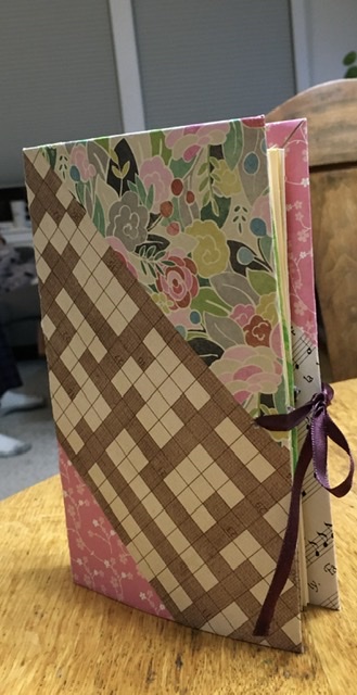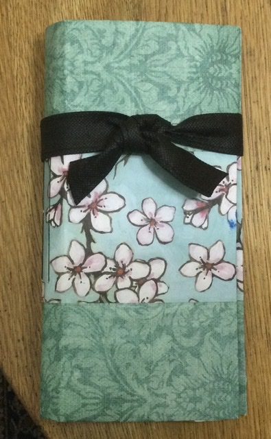 The cover is pretty with flowers, with a recycled tote bag handle for a tie.