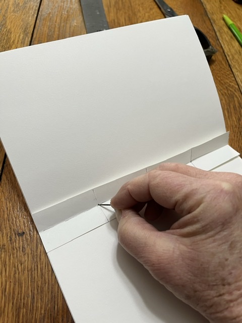 I used a trick from Ruthie to make my measuring device for where to put the stitches in the signatures. A strip of paper as long as my pages are high, folded in half, then each end folded to the center, makes a perfect guide for three holes without nit-picky measuring.