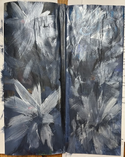 I started with the cover, using a Payne’s Grey craft paint and some silver sparkly paint. Then I slathered craft paint over the pages, making sure to let each one dry before pressing the whole thing flat under a pile of books. This step took a few days.