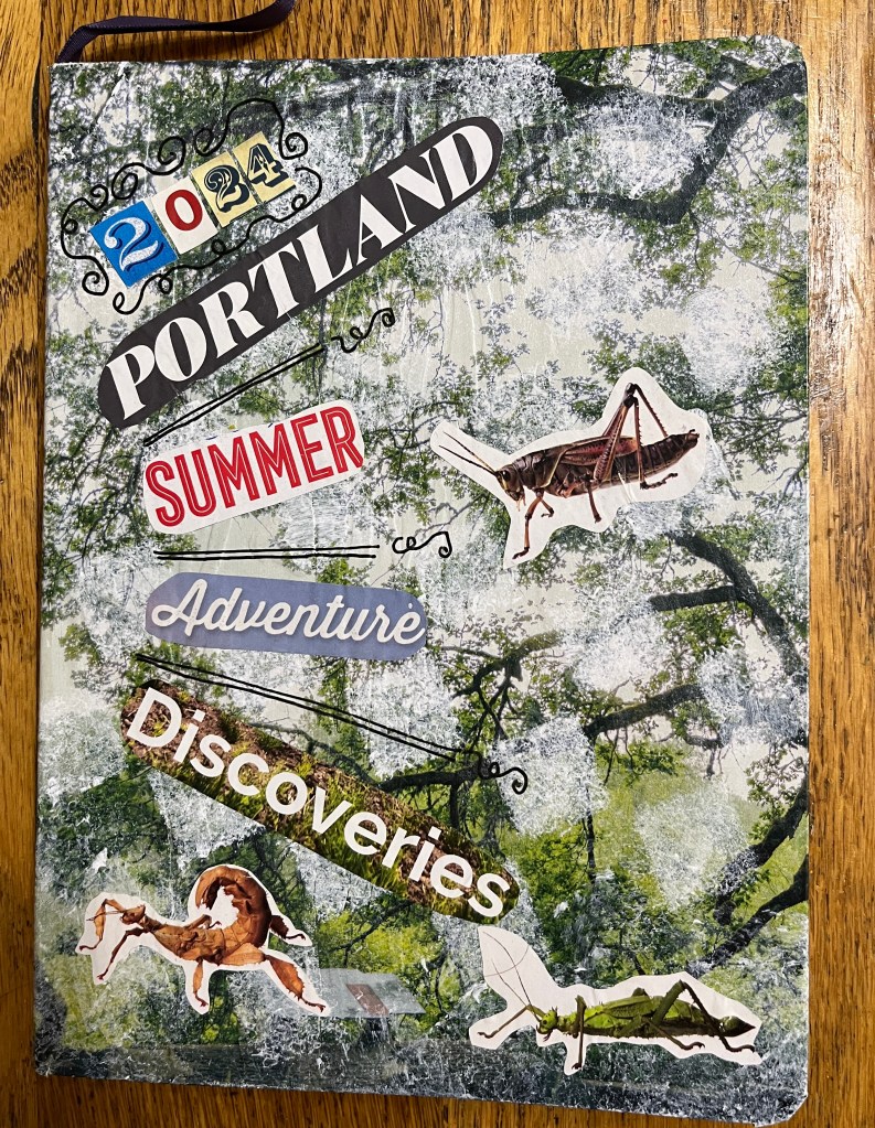 A few weeks ago I made a Garden-themed Art Journal, using a saltine cracker box, needle and thread, glue, and papers from Auntie Bridgett’s cupboard. Here is what it looks like so far.