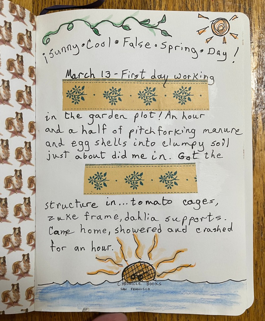 Since there is a garden, there must be a garden journal. For a few years, I made mine from scratch, delighting in learning a new process. Last year, I re-used a found day planner. This year, I looked in the box of books that we are giving away.