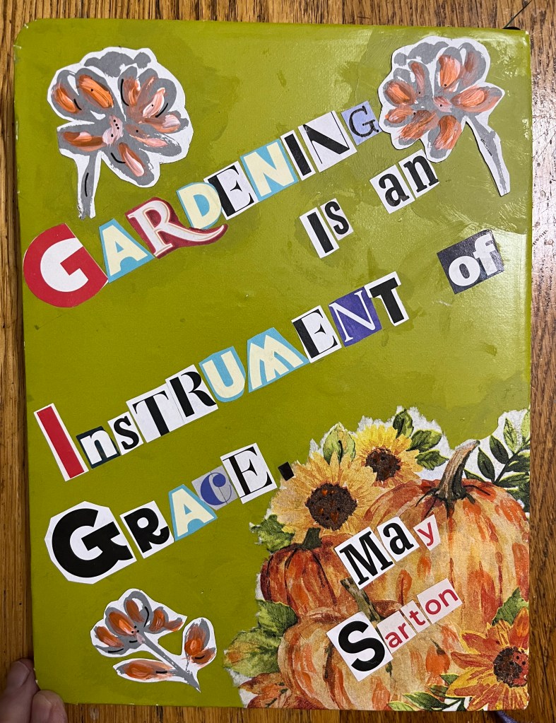 It still looked a bit empty, so I hunted up a gardening quote I like and gave it the “ransom note” treatment. I added few more flowers and a bit of paint. You think maybe it’s too much?