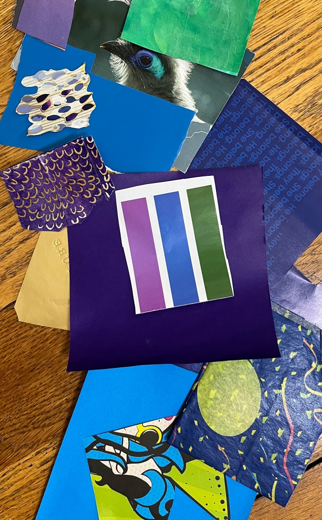 I want the Journal to reflect the colors of the SOAK “Electric Ocean” theme poster, so I dug into my collage boxes and found some good candidates.