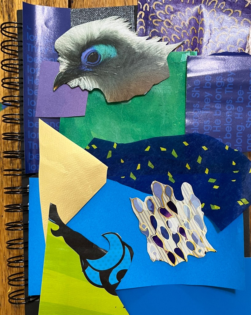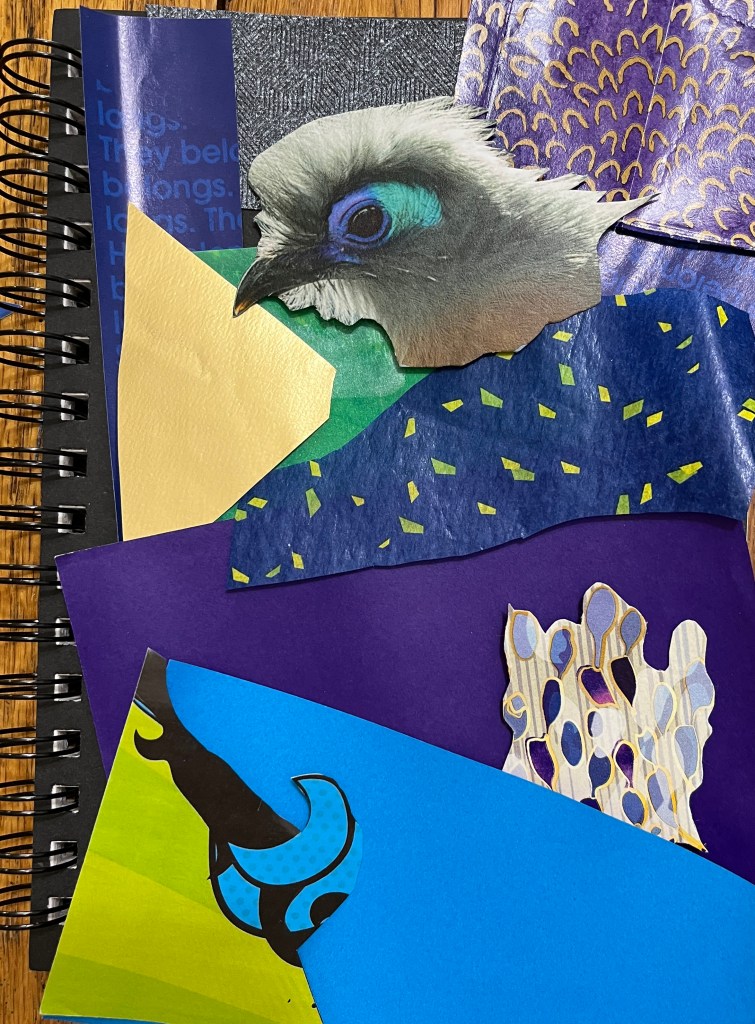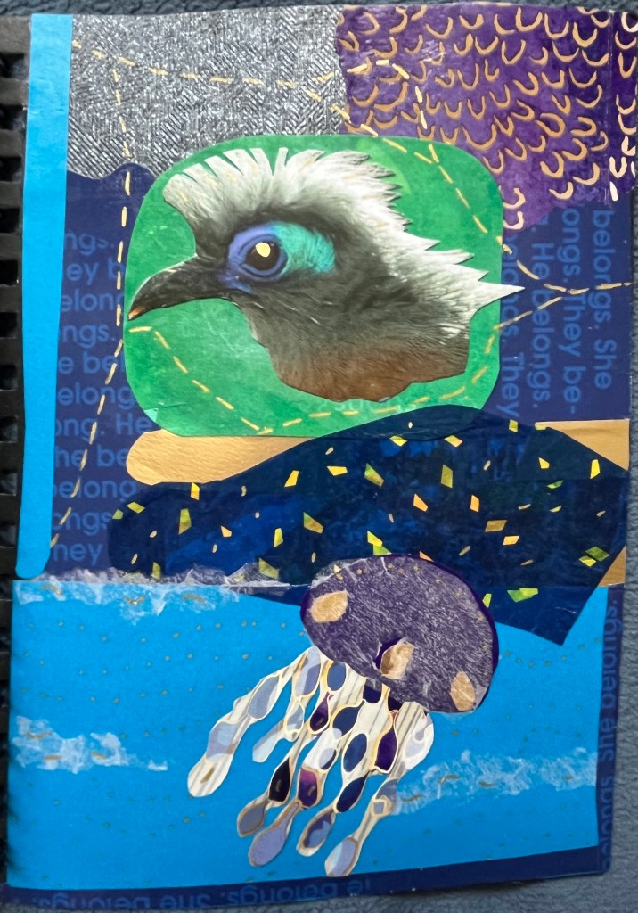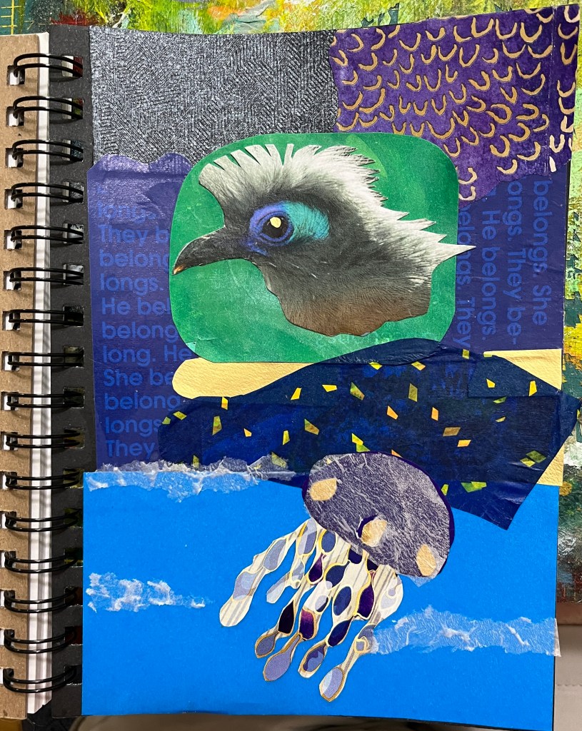 But what sort of art should be in this journal? At another suggestion from Ruthie, I started using the idea of “The Exquisite Corpse”, a drawing game Cousin Kestrel taught me, to play with a new kind of collage.