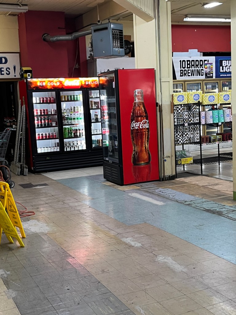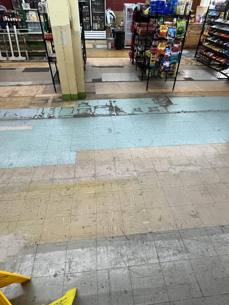 They have been doing well enough to finance some renovations, so they are taking out old shelving and updating the flooring. They aren’t allowed to pull up the patchwork of old flooring (I’m guessing it is asbestos tile… it looks like what I grew up with) so they are leveling all the layers as best they can before laying some new flooring down.
