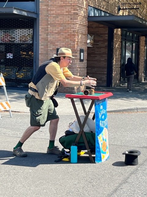 First off, this character was doing an old-fashioned silly magic act, making balls disappear under cups and pulling coins from behind kids’ ears. It was fun and felt just right.