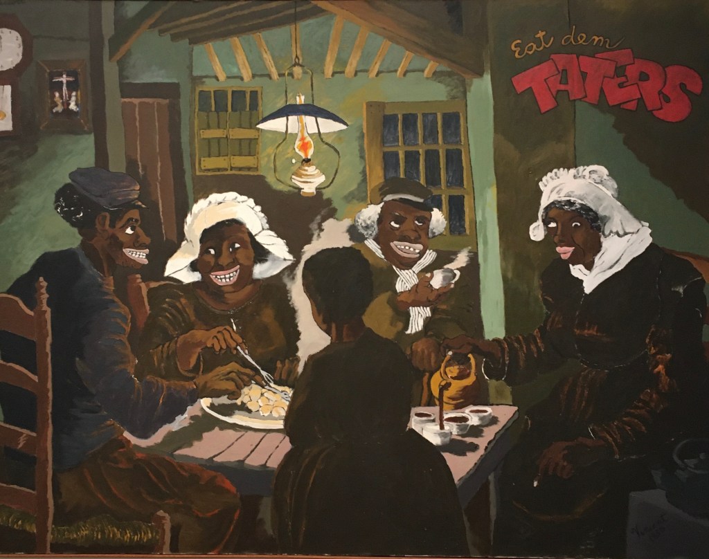 He began doing parodies of famous art, replacing the original white subjects with cartoonish, grinning black people, in the style of “happy darkies” of old racist posters. Van Gogh’s “Potato Eaters” got a makeover as “Eat dem Taters”. This was his way, he said, of “interjecting blacks into art history.”