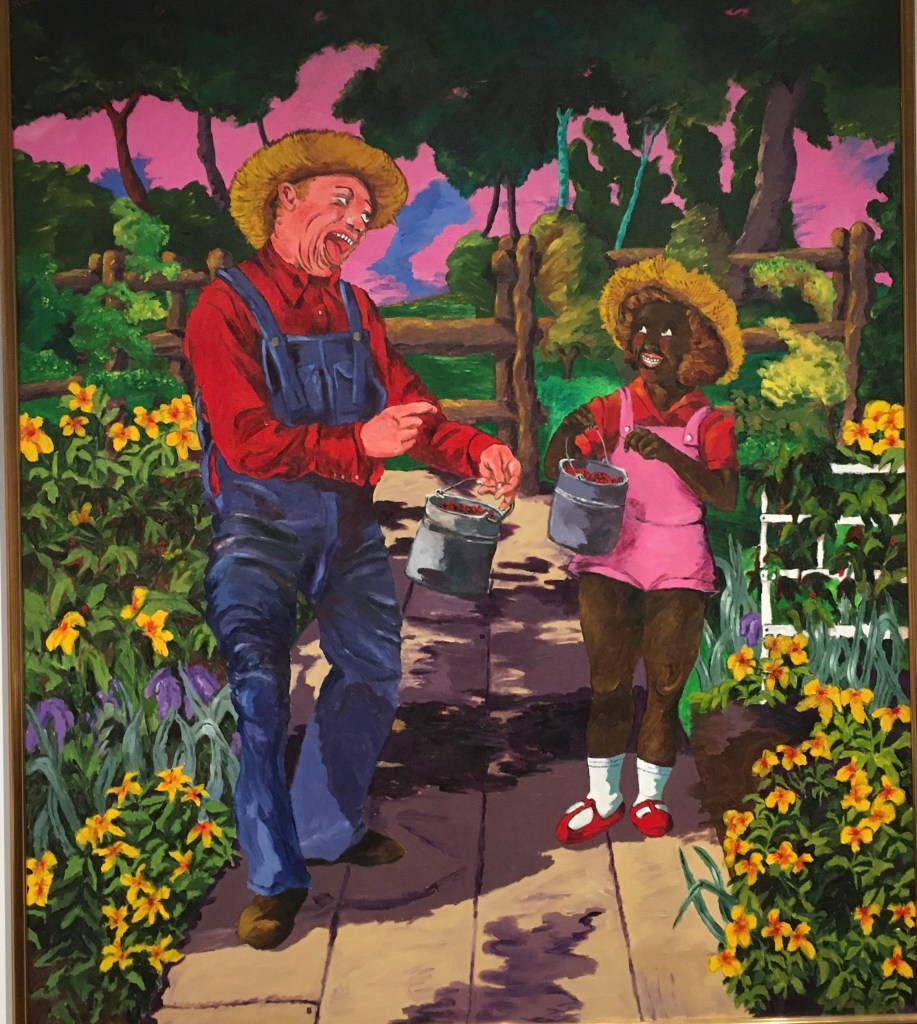 Another jarring image was his painting of a famous scene from “Rebecca of Sunnybrook Farm”, where he swapped the races of Shirley Temple and Bill “Bojangles” Robinson. The ‘white’ Robinson’s exaggerated expression looks bizarre but is an accurate reflection of the photograph, shown alongside the painting.