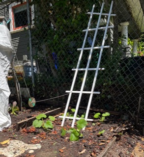 The yellow summer squash are getting tall, and I put a loop of yarn on the pumpkin to encourage it to climb on the ladder rather than the tomato cages.