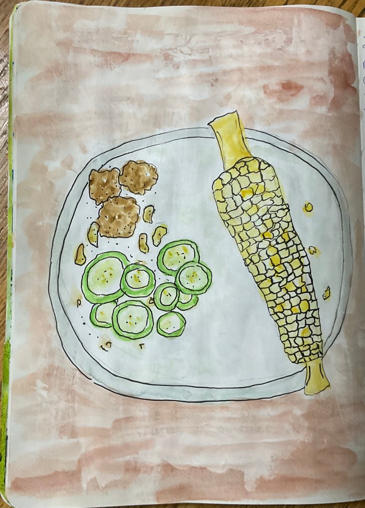 And speaking of bees, they have been busy pollinating my zucchinis! We picked one, cooked and ate it before I remembered to take a picture of it. But I did paint a picture of the dinner for my garden journal! The corn on the cob was from the Hollywood farmer’s market and the chicken meatballs were from Trader Joe’s. Yummy!