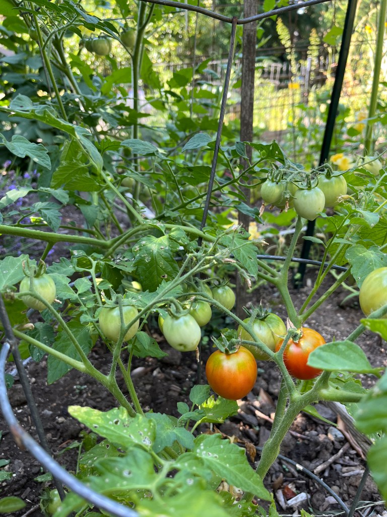 Our first tomato, “Isis Candy” by name, came ripe and was delicious.