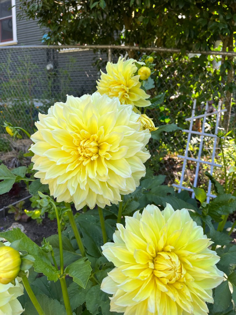 Laverne and Shirley, our dahlias, are as tall as I am and have a couple dozen blooms. The bright yellow blossoms are fat and ruffled and almost as big as our dinner plates. I cut some to decorate our table and left some others for the bees.
