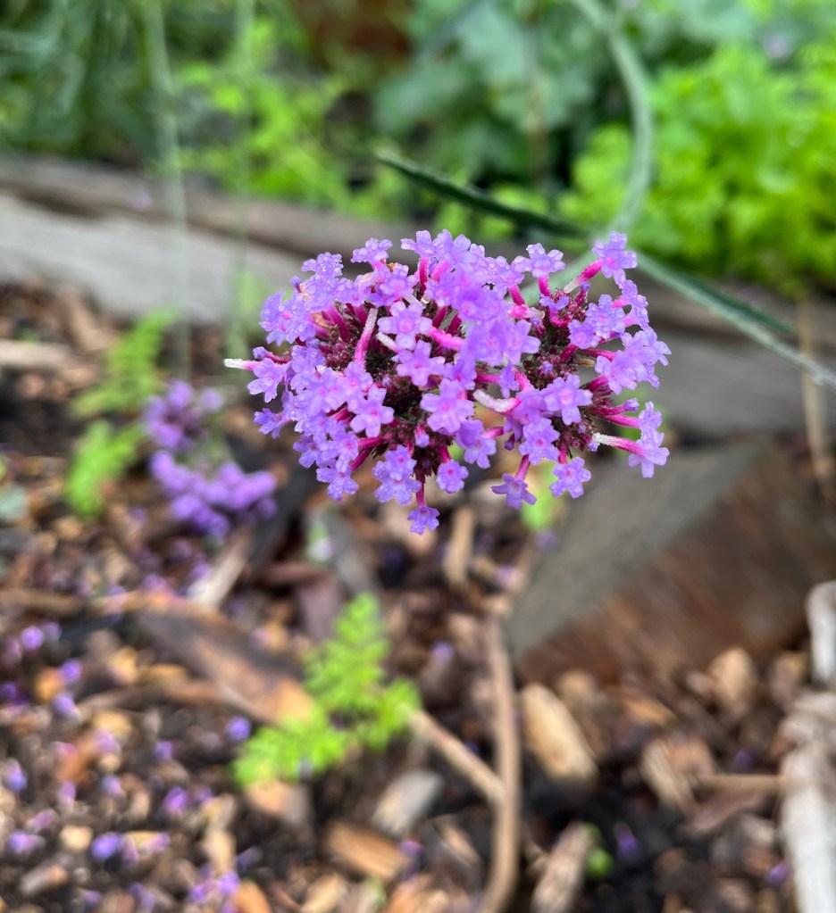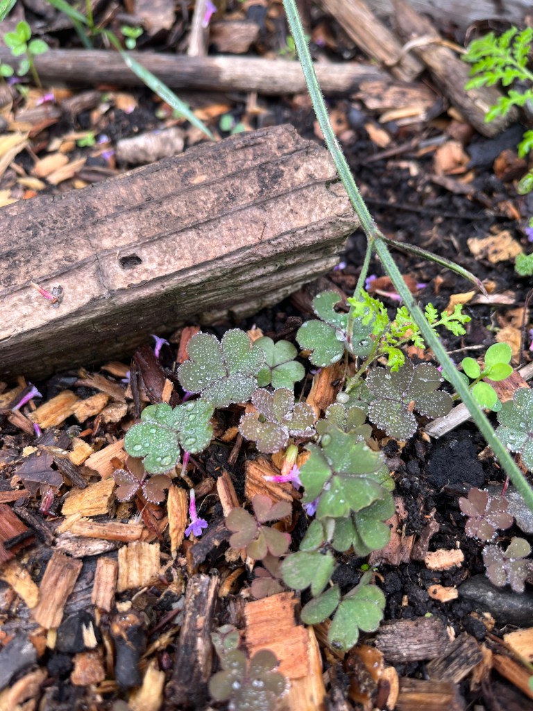 My back has been sore from too much lifting of wheelbarrows, so today I sat right down to pull weeds. And, as so often happens, I found beauty I hadn’t expected.